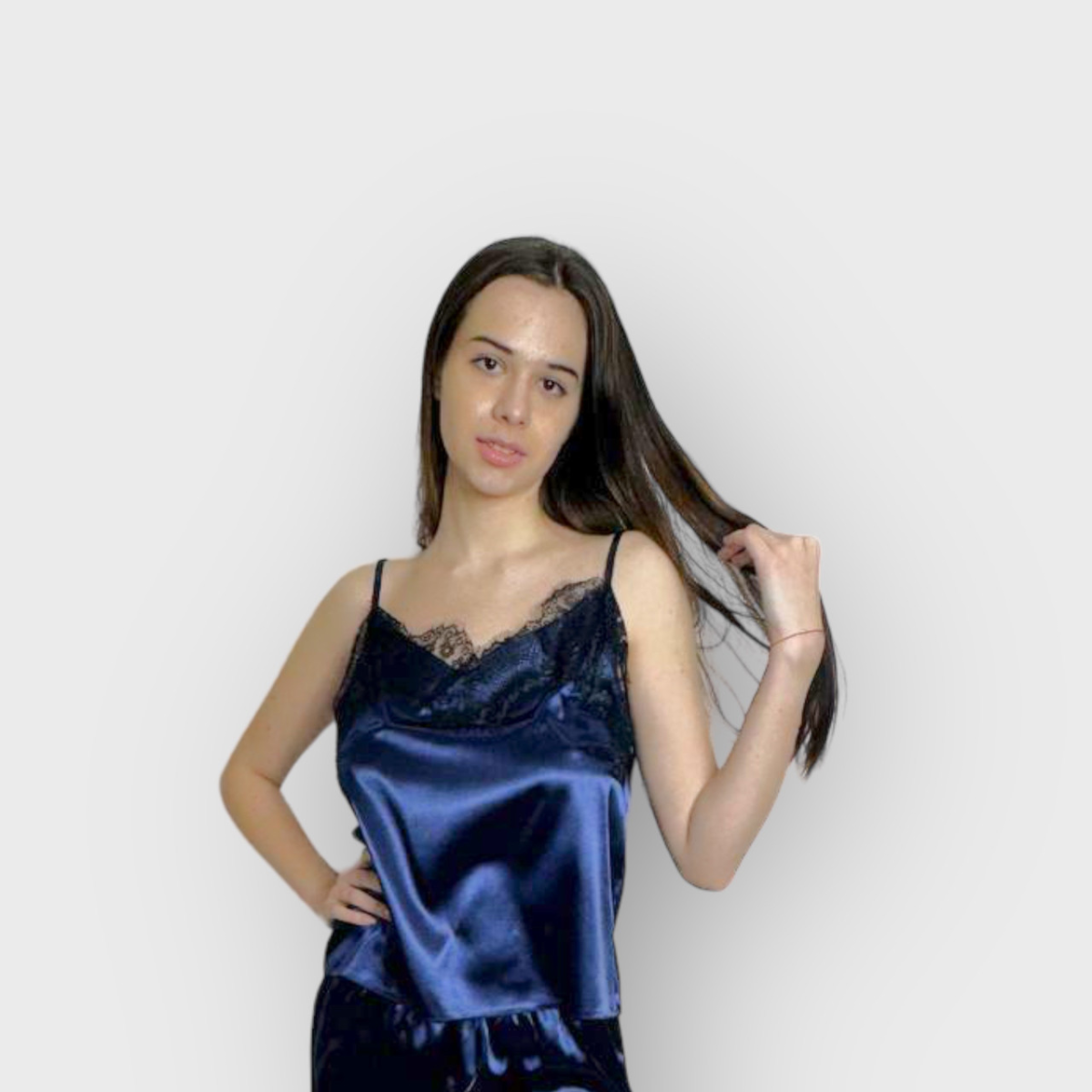 Піжама жіноча атласна з мереживом майка+шорти, темно-синя, XS/S