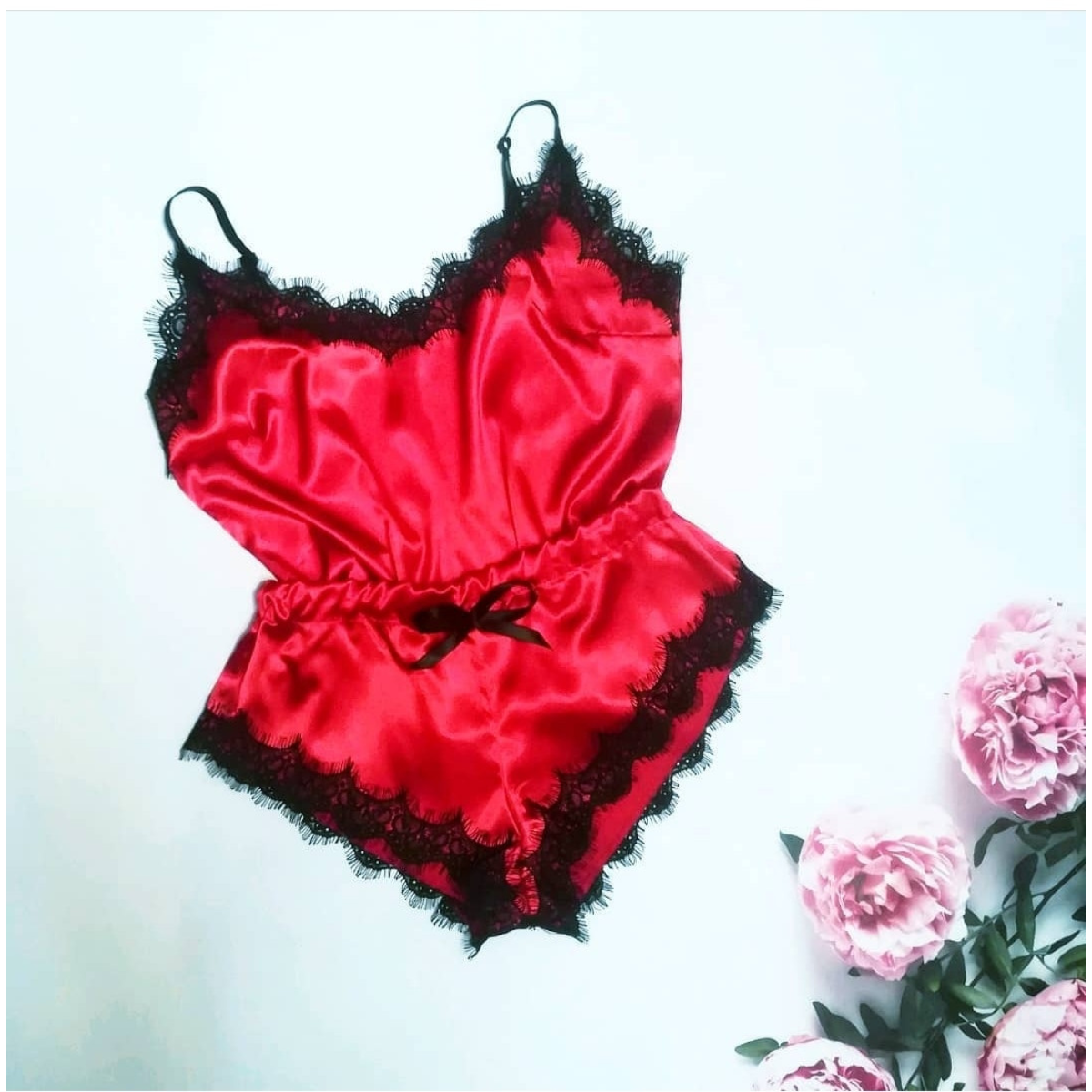 Піжама жіноча атласна червона з мереживом, червона, XS