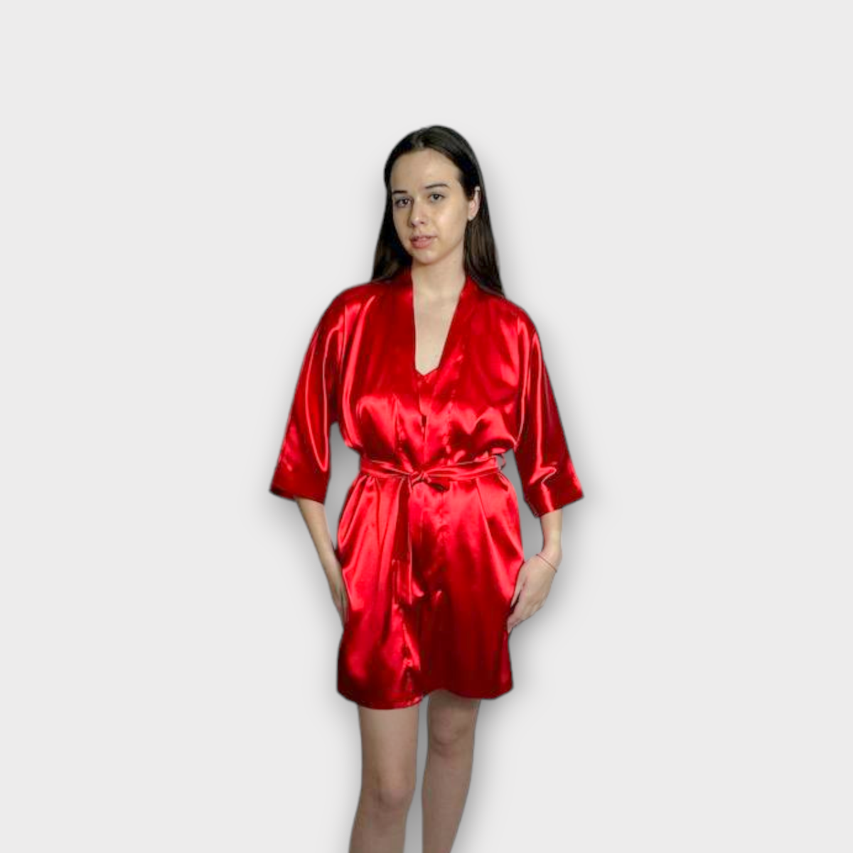 Халат жіночий атласний під пояс довжина 90см червоний, XS / S