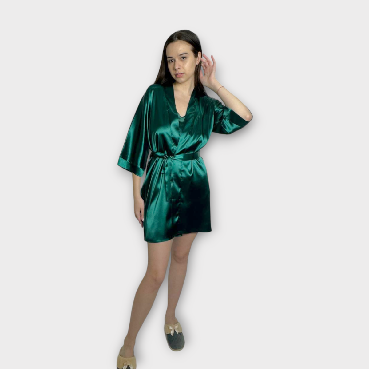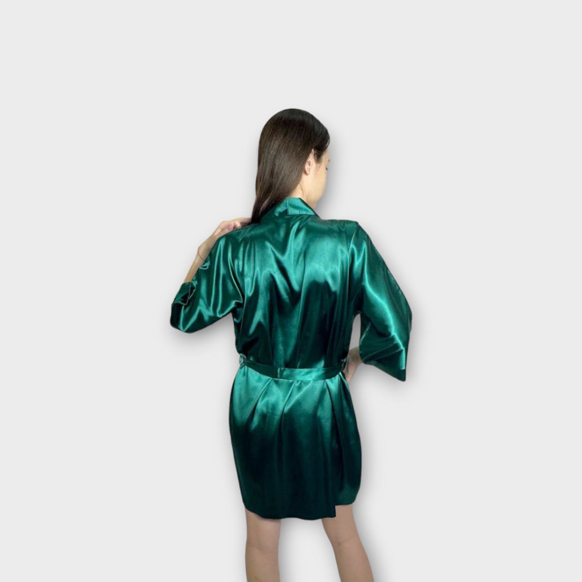 Халат жіночий атласний під пояс довжина 90см зелений, XS/S