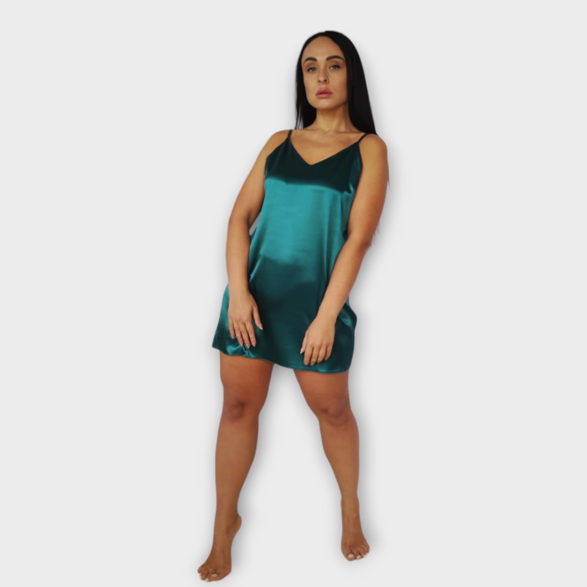 Жіноча нічна сорочка атласна на регульованих бретелях. Зелена, XS