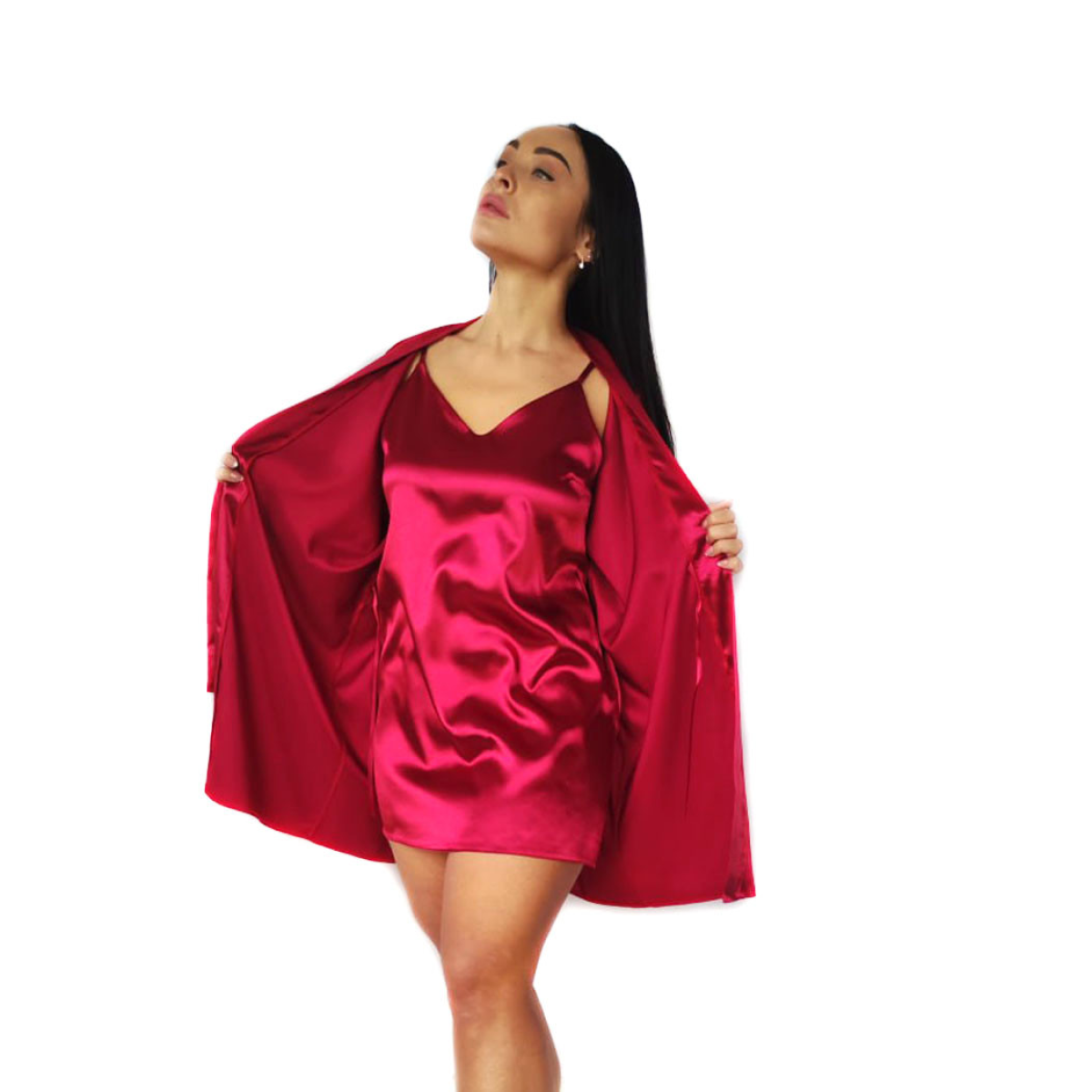 Жіноча атласна нічна сорочка з халатом бордо М