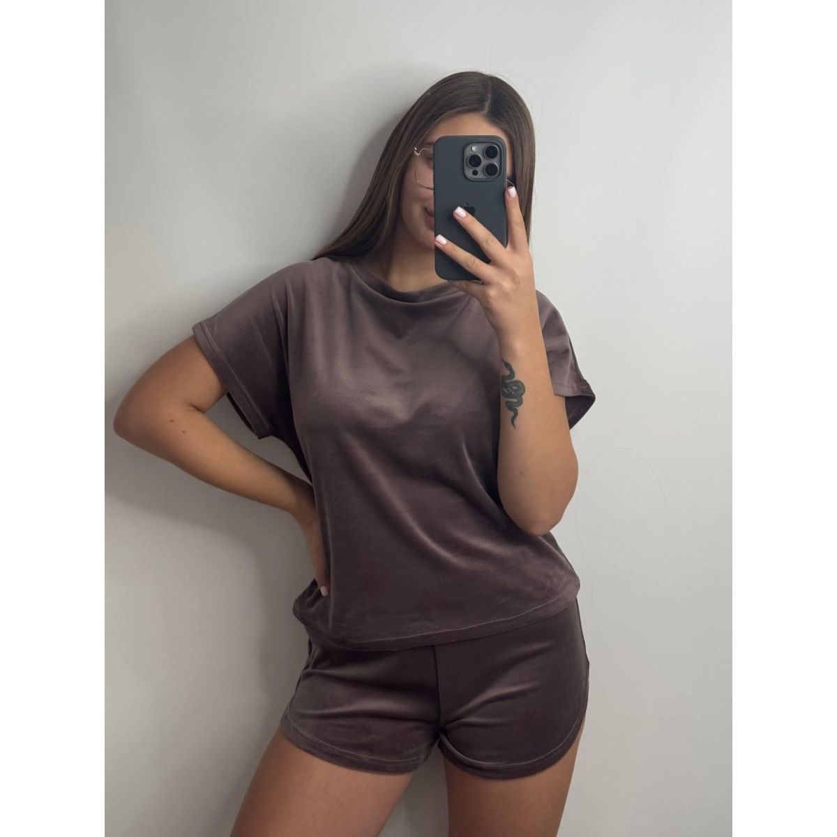 Піжама футболка + шорти з плюшевого велюру світлий мокко, M