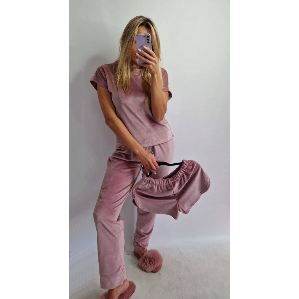 Піжама-комплект (футболка + шорти + штани) з плюшевого велюру Рожева пудра, L