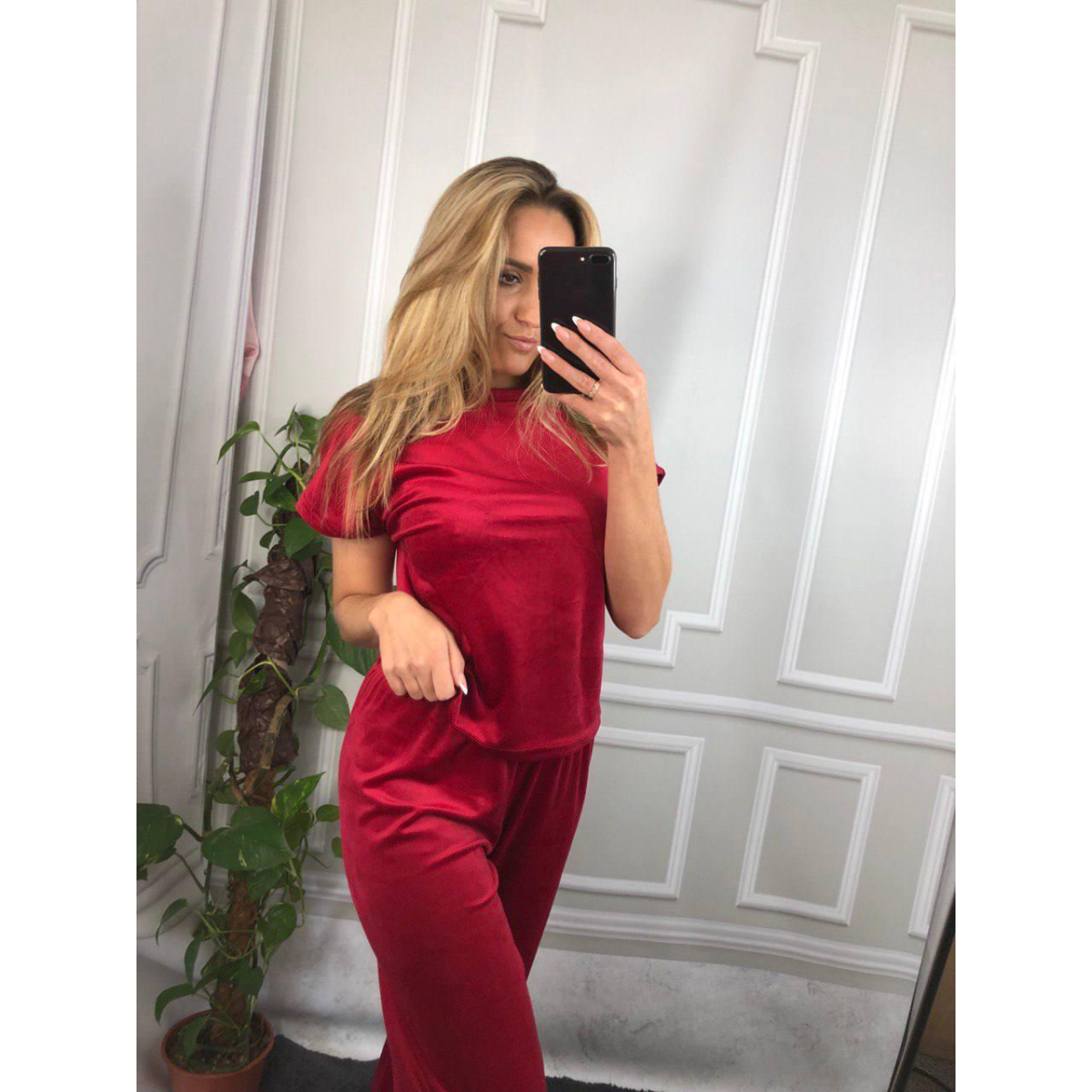 Піжама-комплект (футболка + шорти + штани) з плюшевого велюру вишневий, L