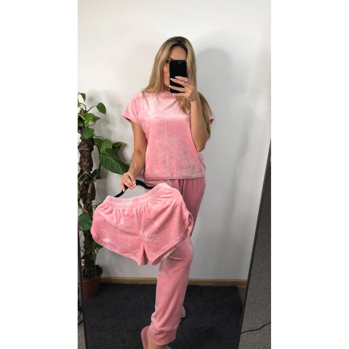 Піжама-комплект (футболка + шорти + штани) з плюшевого велюру світлий персик, XXL