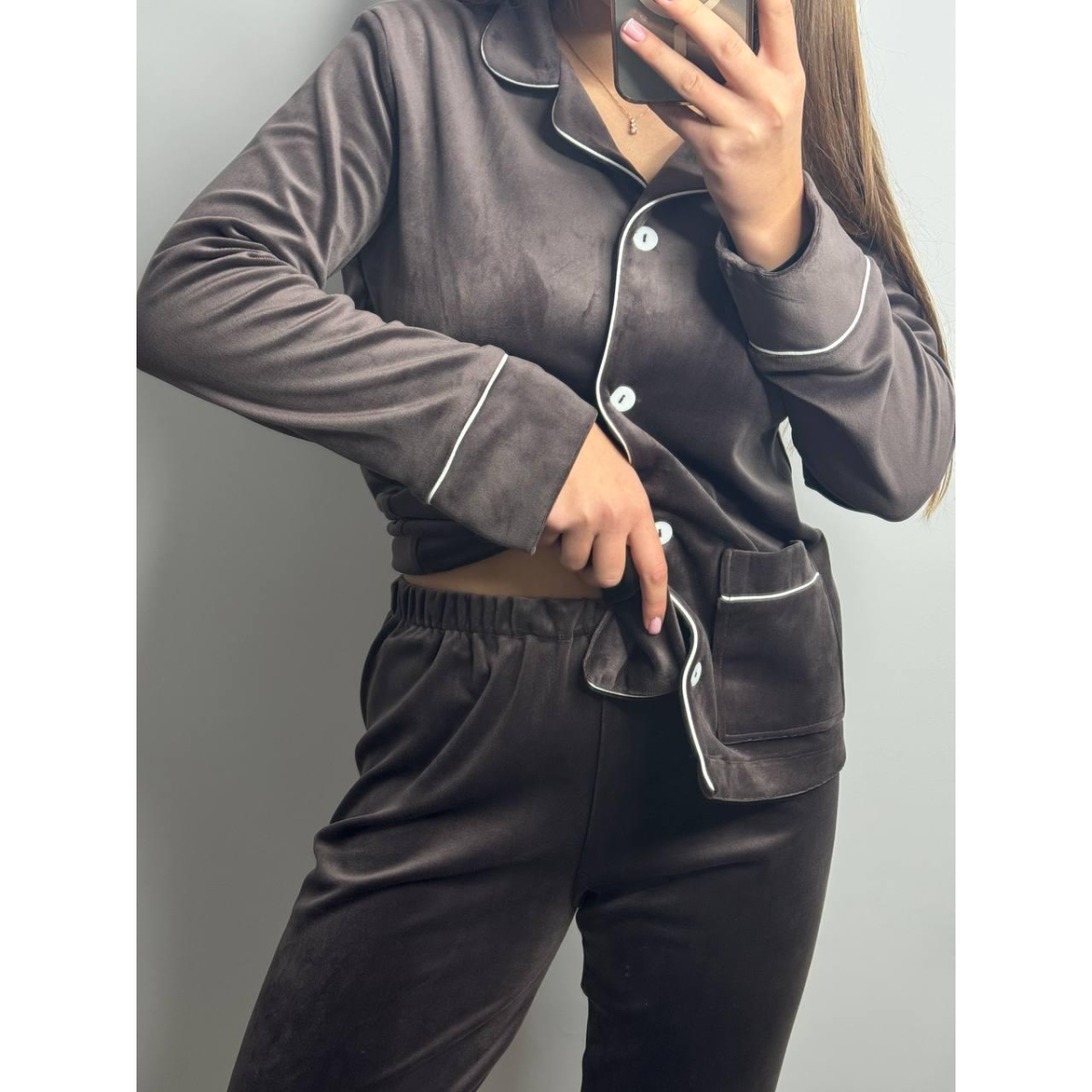 Костюм із плюшевого велюру на ґудзиках із двома кишенями. Шоколад, XXL
