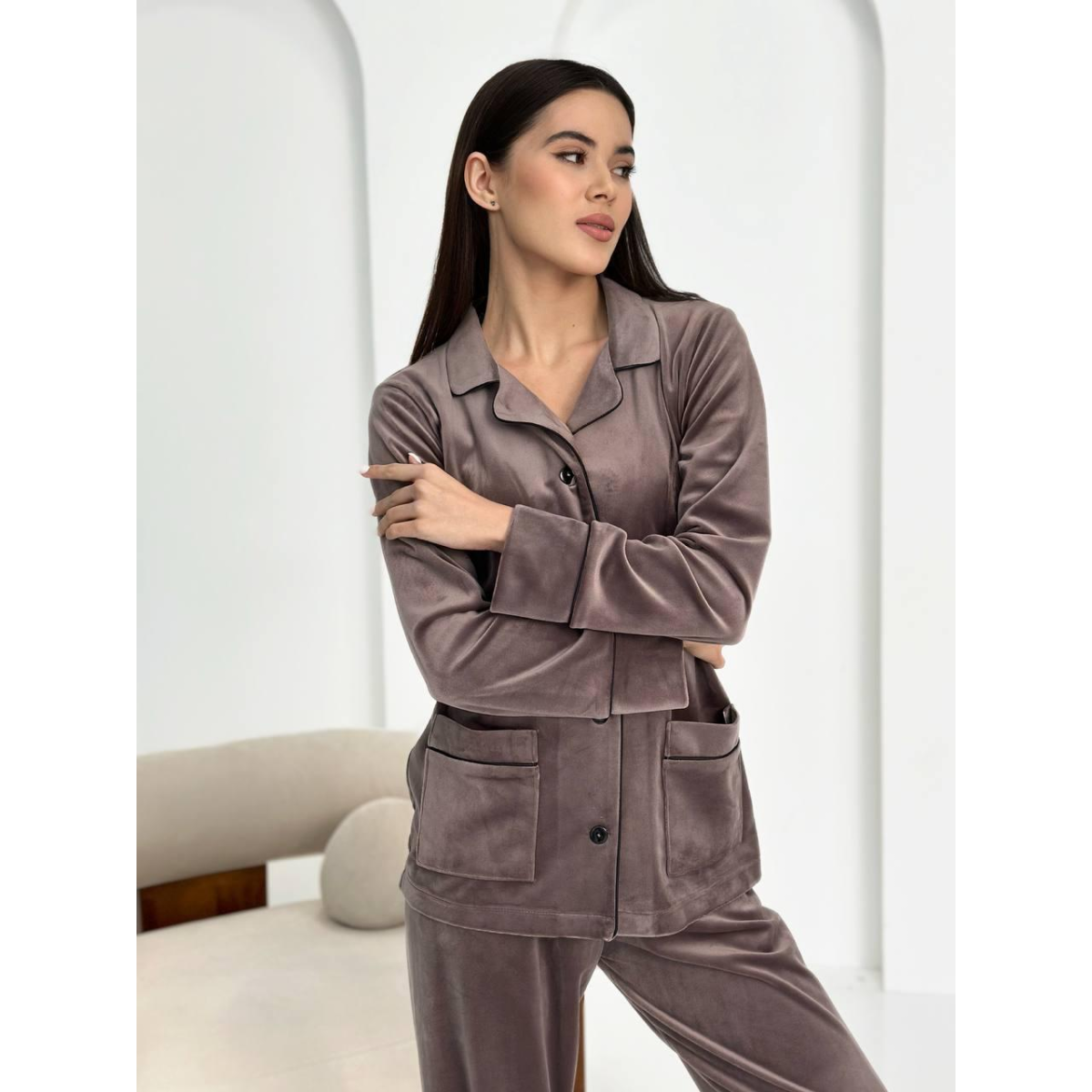 Костюм із плюшевого велюру на ґудзиках із двома кишенями. Коричневий, XXL
