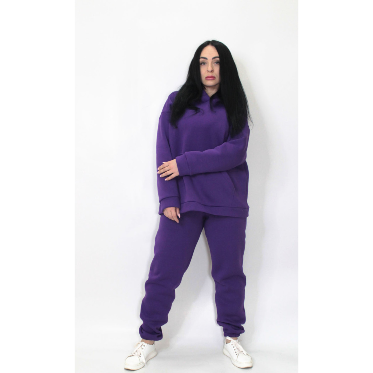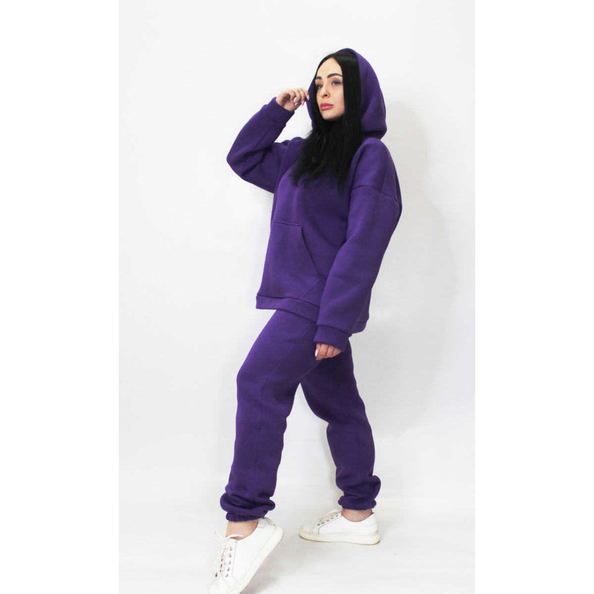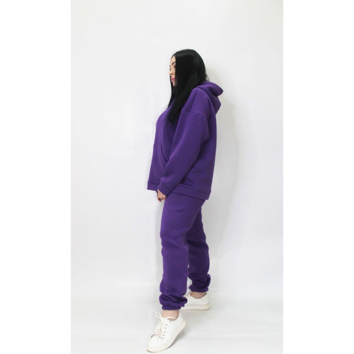 Худі-кенгуру із глибоким капюшоном. Штани джогери на гумці, без кишень та прошитою широкою гумкою на поясі.
