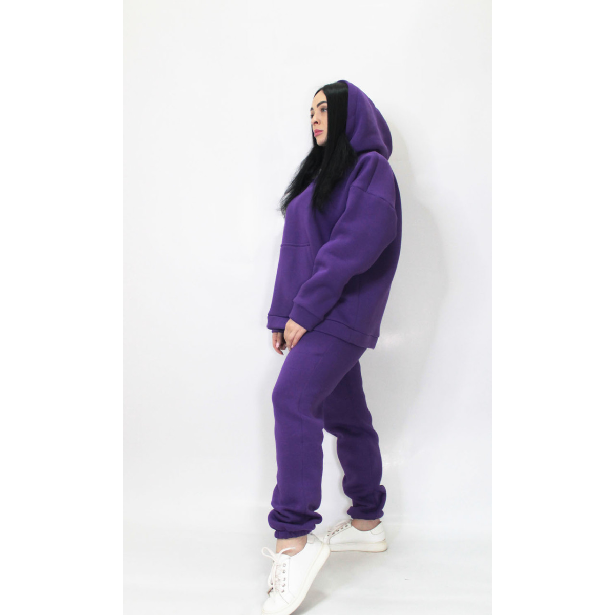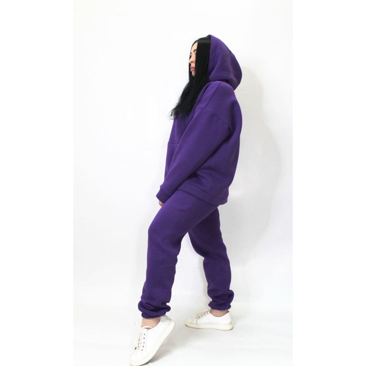 Худі-кенгуру із глибоким капюшоном. Штани джогери на гумці, без кишень та прошитою широкою гумкою на поясі.