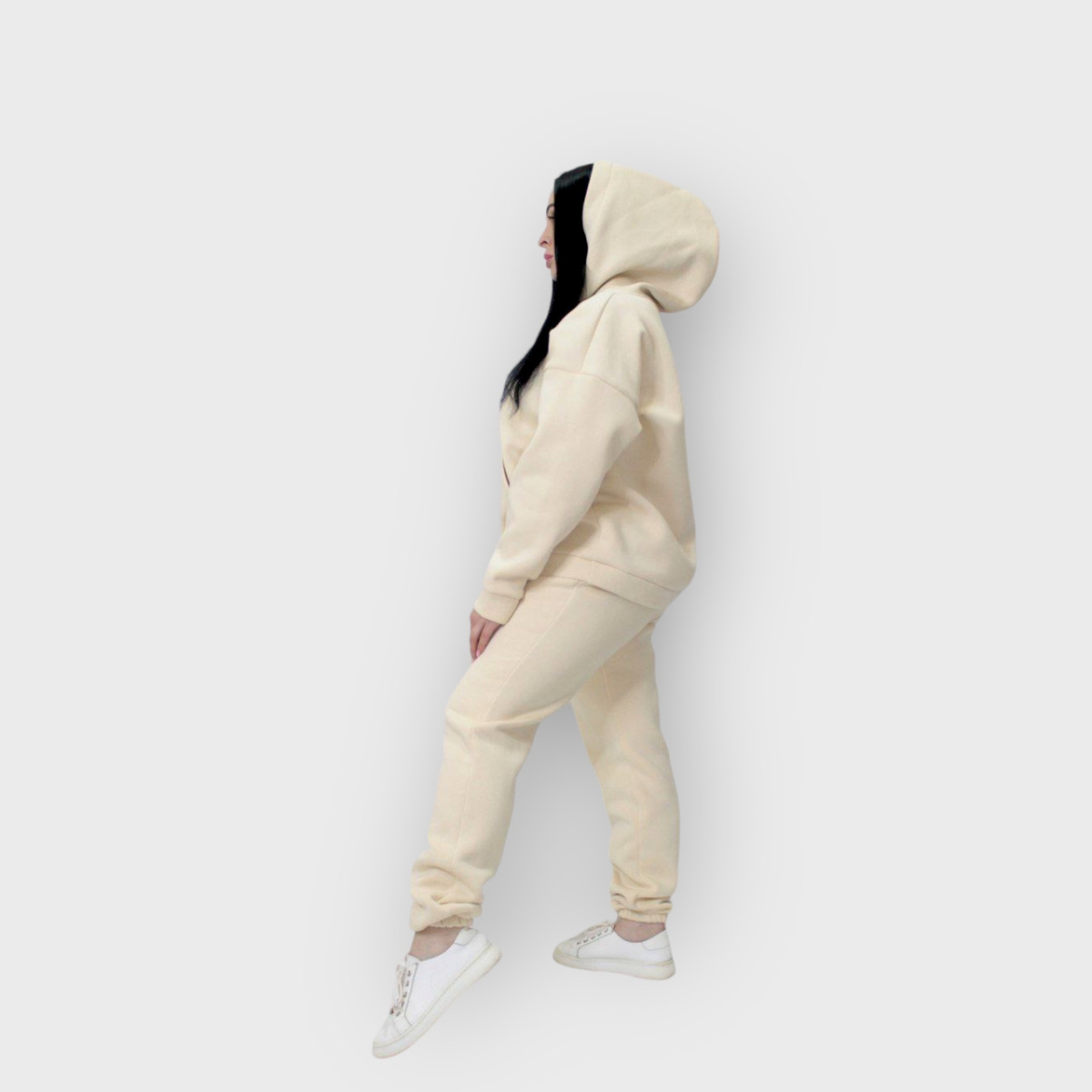 Худі-кенгуру із глибоким капюшоном. Штани джогери на гумці, без кишень та прошитою широкою гумкою на поясі.