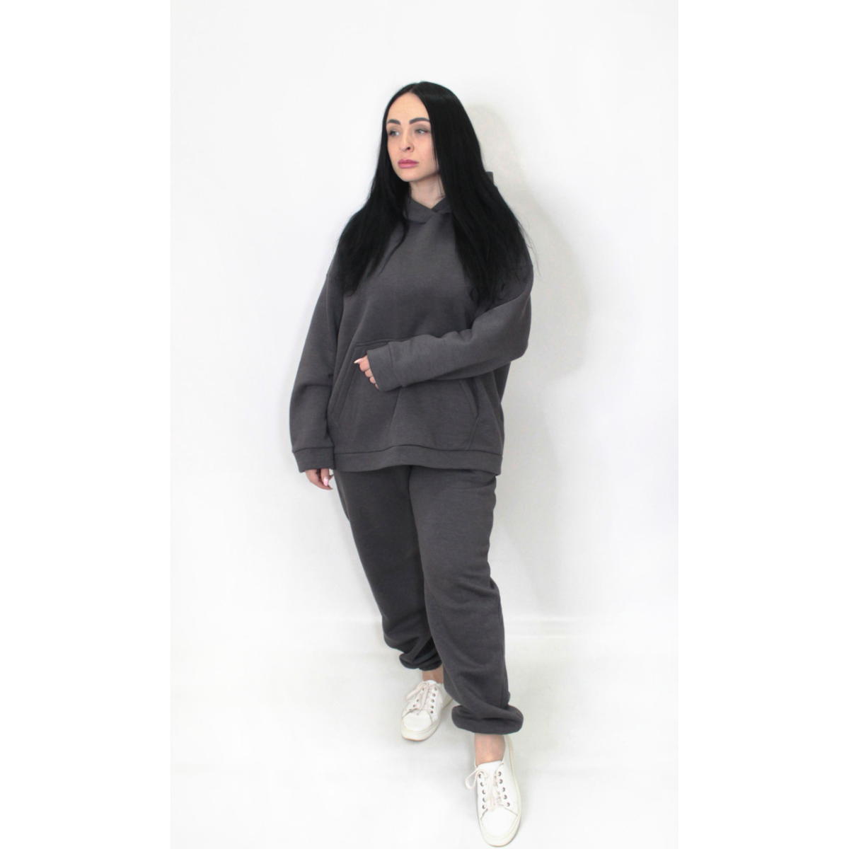 Худі-кенгуру із глибоким капюшоном. Штани джогери на гумці, без кишень та прошитою широкою гумкою на поясі.