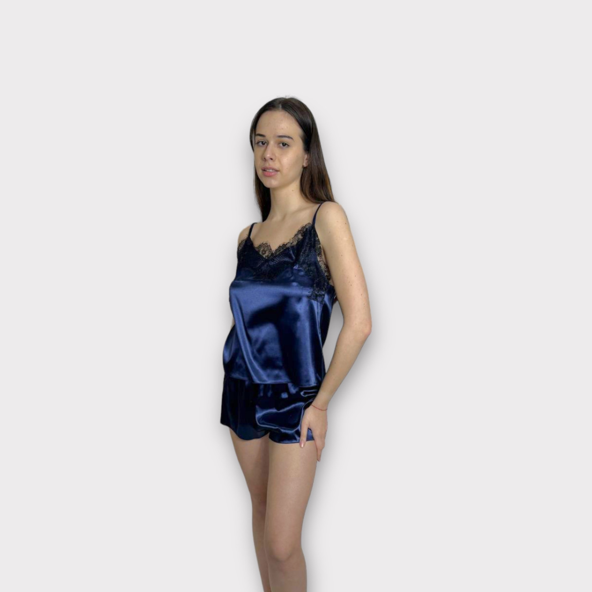 Піжама жіноча атласна з мереживом майка + шорти, темно-синя XL/2XL