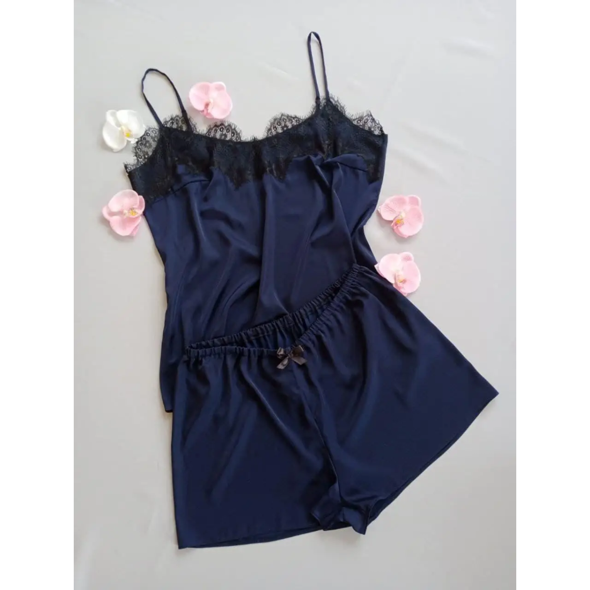 Піжама жіноча атласна з мереживом майка + шорти, темно-синя, 3XL
