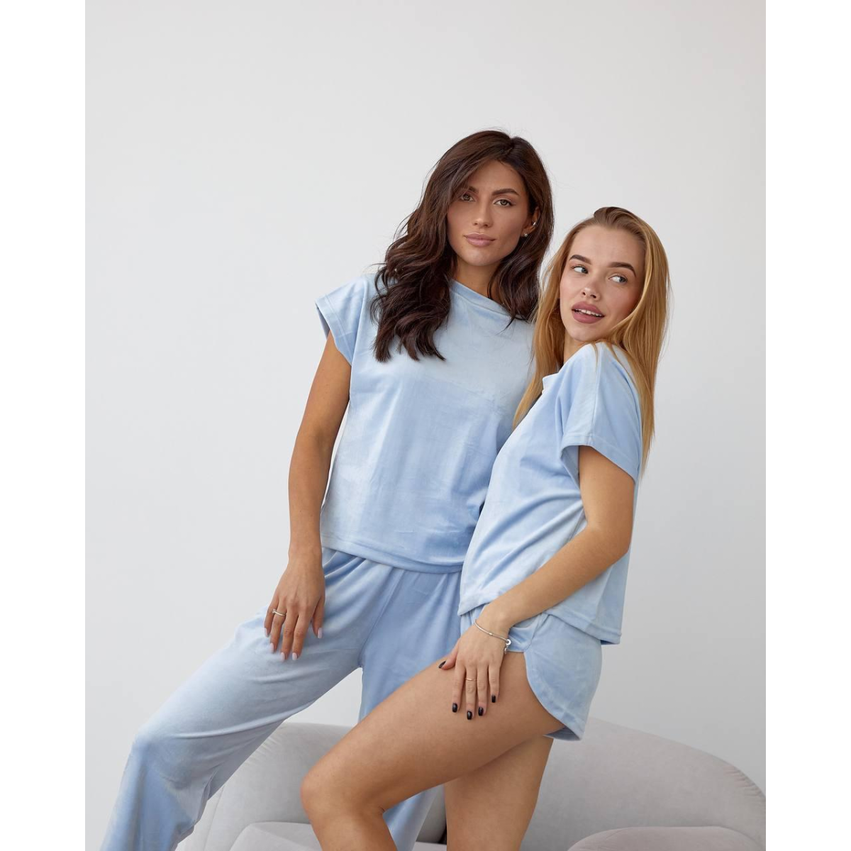 Піжама-комплект (футболка+шорти+штани) з плюшевого велюру, блакитний, XL