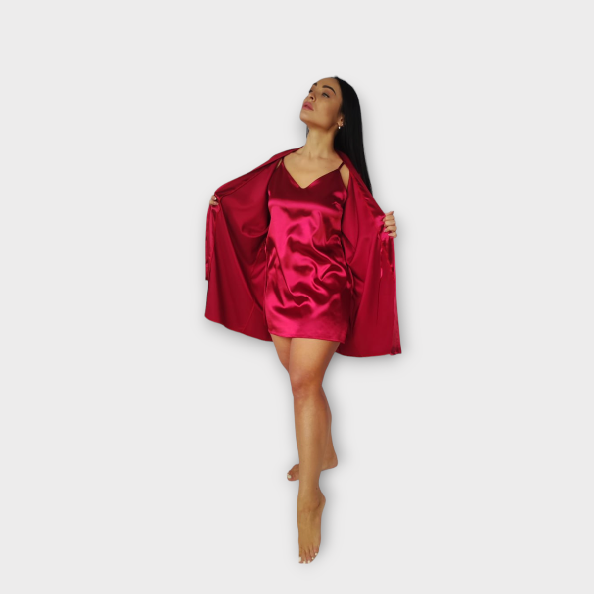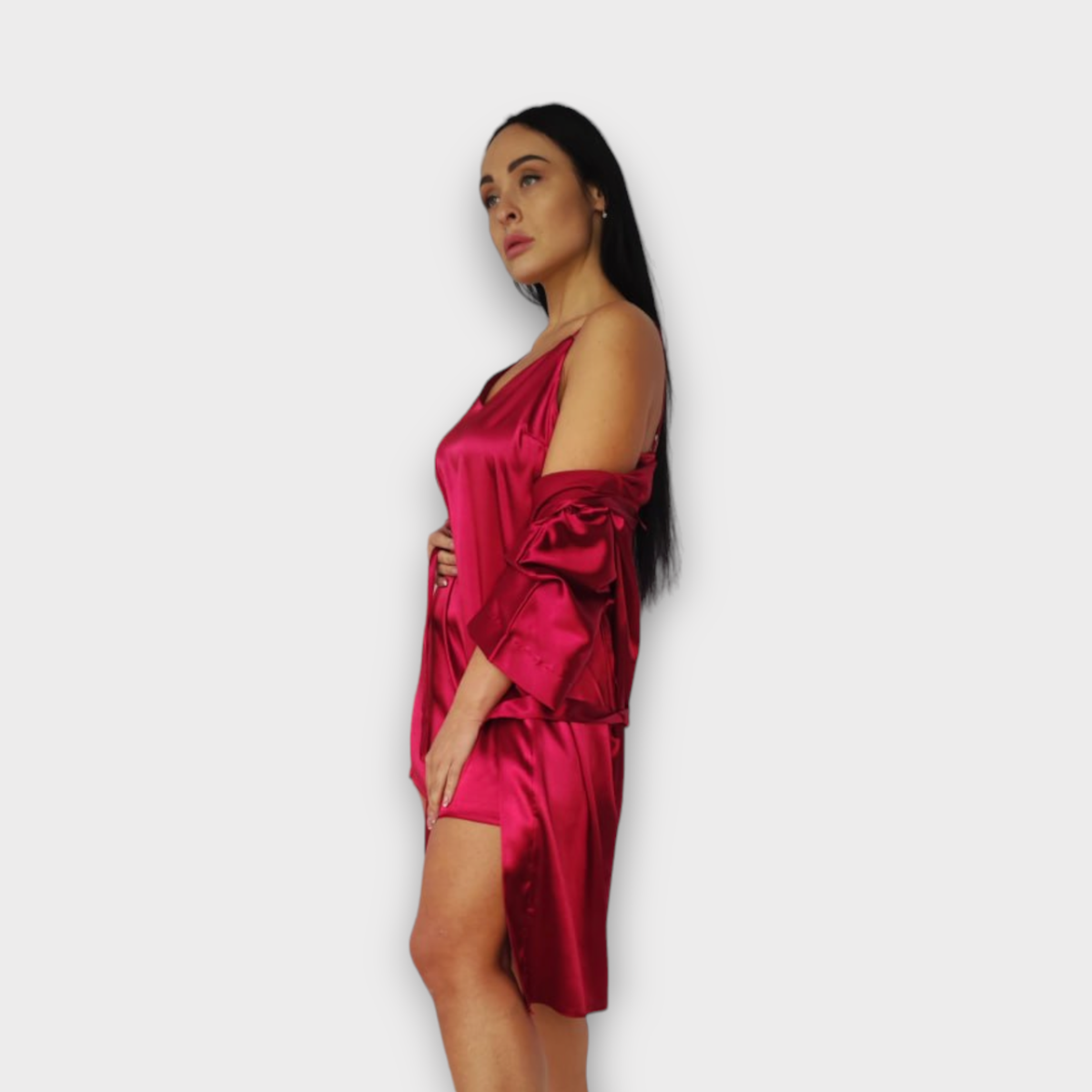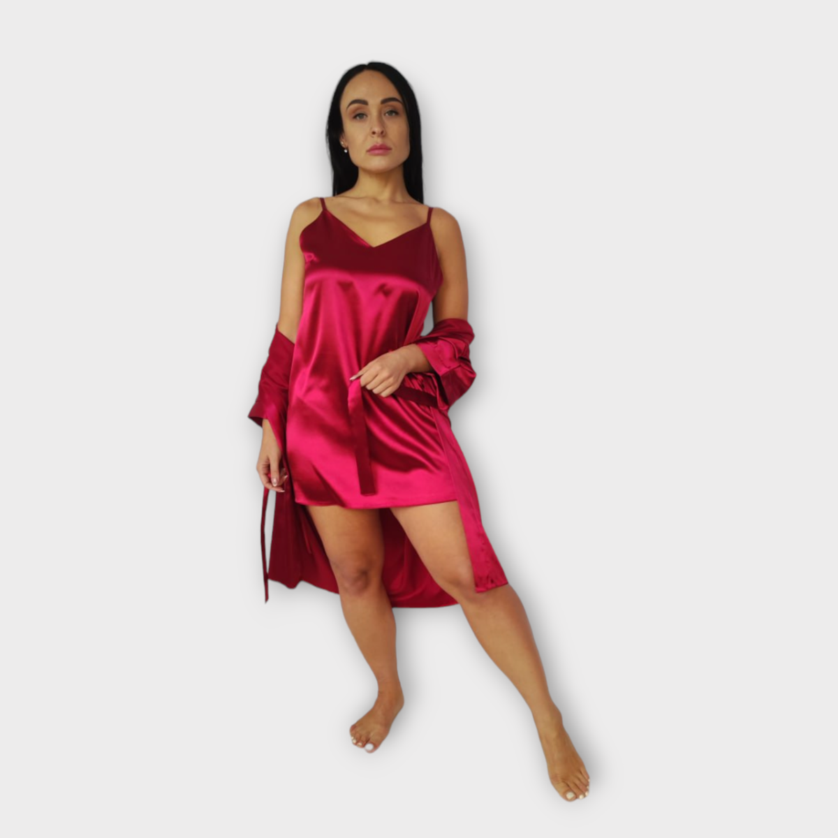 Атласна нічна сорочка м“яка і приємна до тіла, виконана з тонкого стрейч-атласу, що дає додаткову свободу руху з халатиком під пояс (всередині на зав“язках).