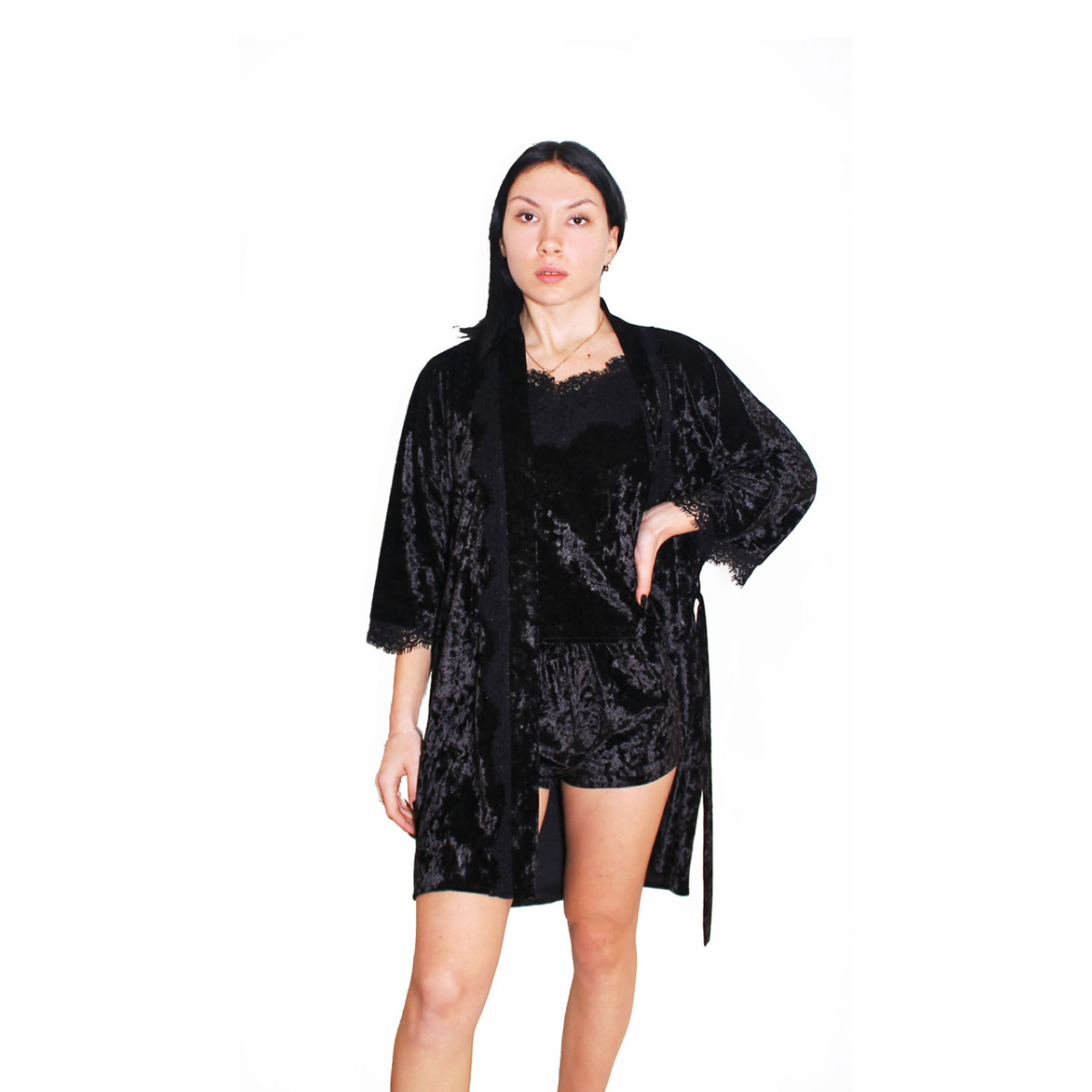 Бажаєте виглядати розкішно вдома? Тепер це дуже просто з комплектом з мармурового велюру, прикрашеного мереживом. У ньому ви відчуєте себе неймовірно чарівною.