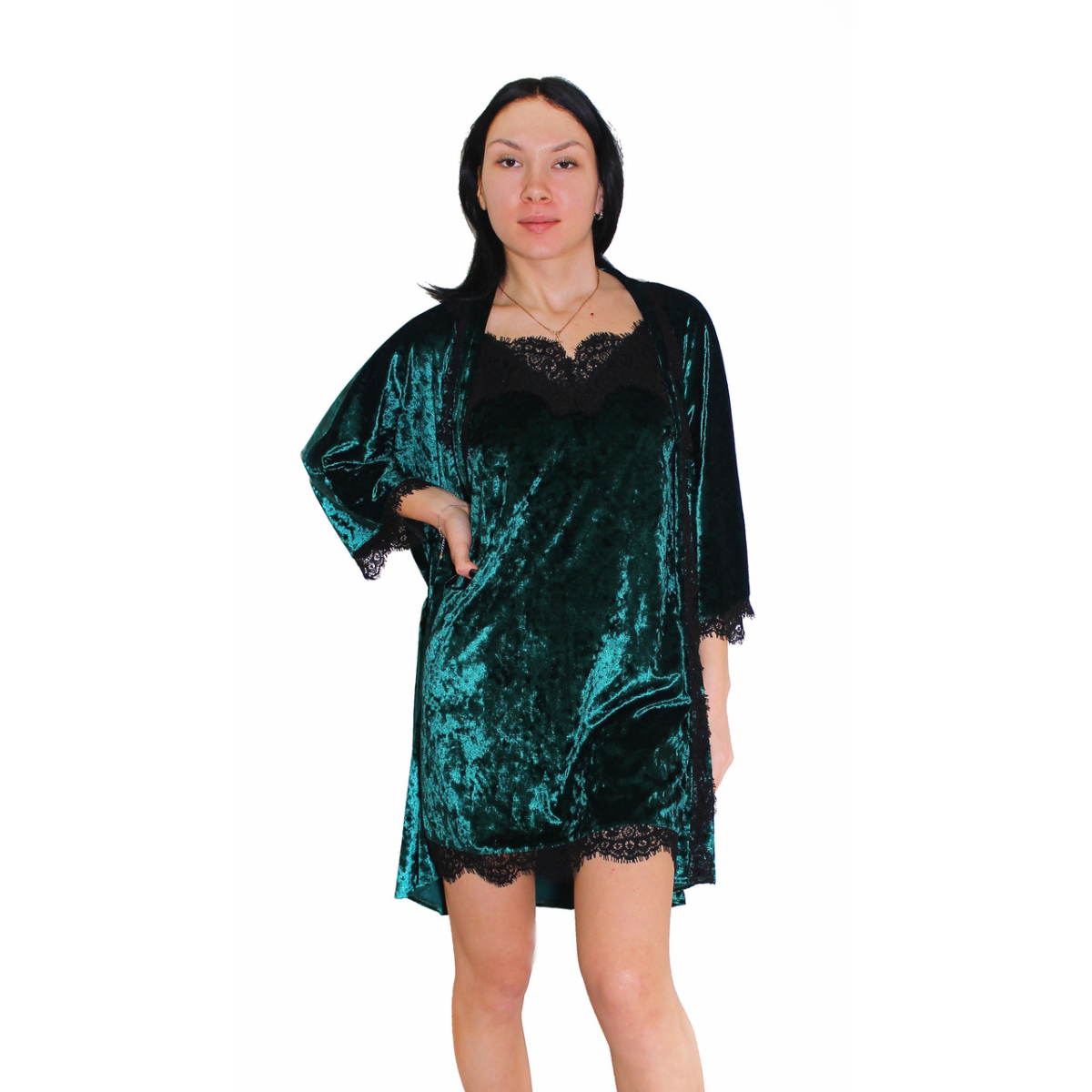 Бажаєте виглядати розкішно вдома? Тепер це дуже просто з комплектом з мармурового велюру, прикрашеного мереживом. У ньому ви відчуєте себе неймовірно чарівною.