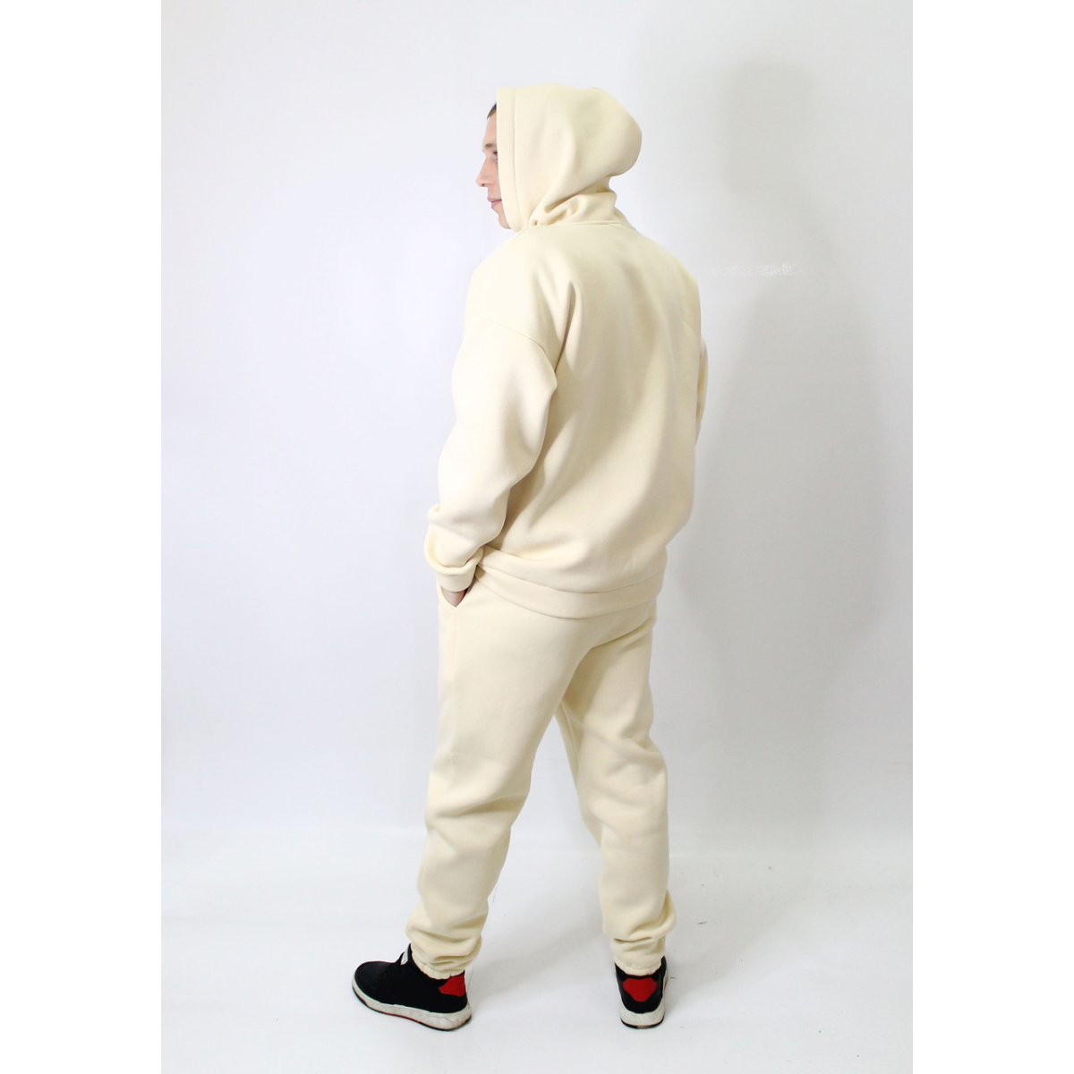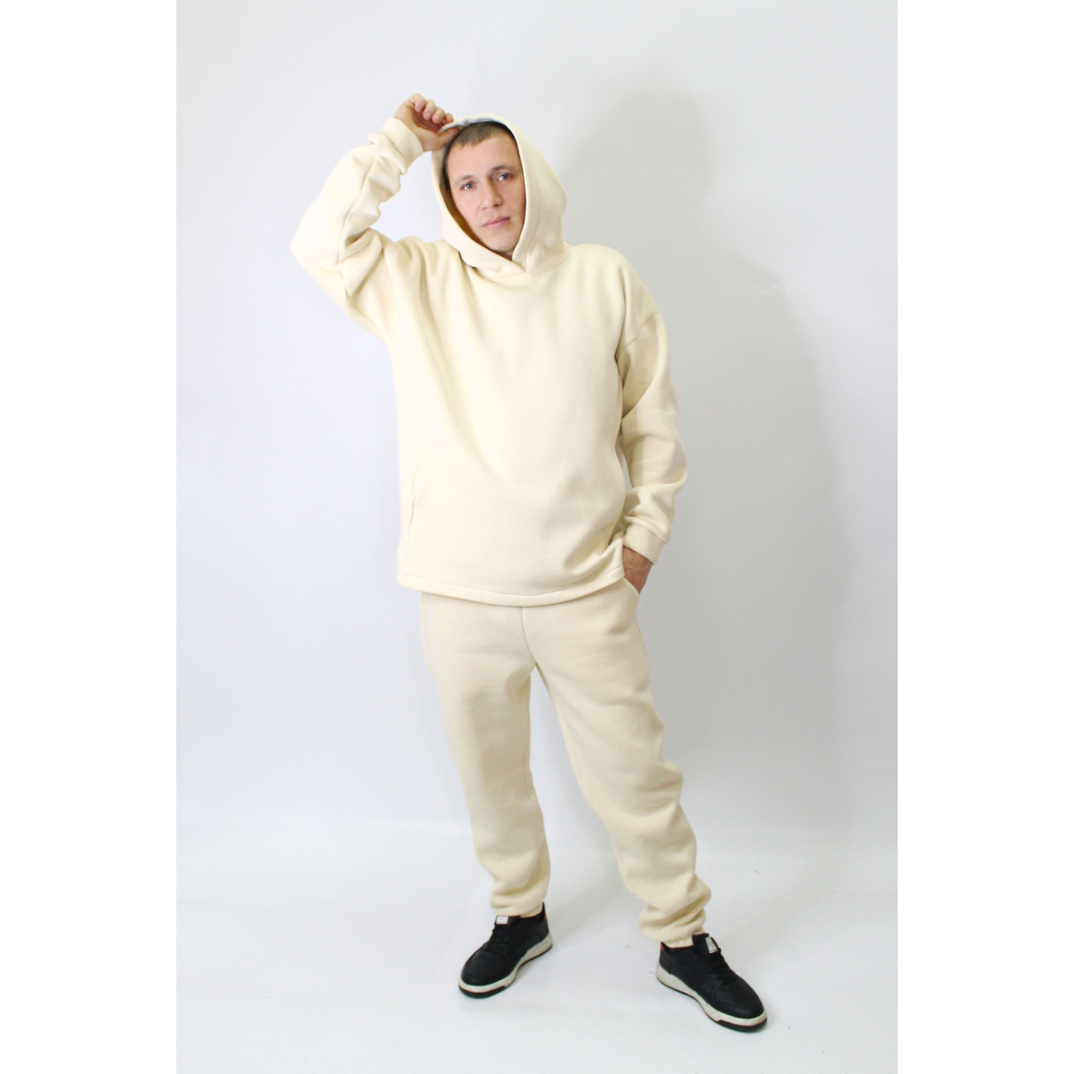 Худі-кенгуру із глибоким капюшоном. Штани джогери на гумці, з двома кишенями та прошитою широкою гумкою на поясі.
