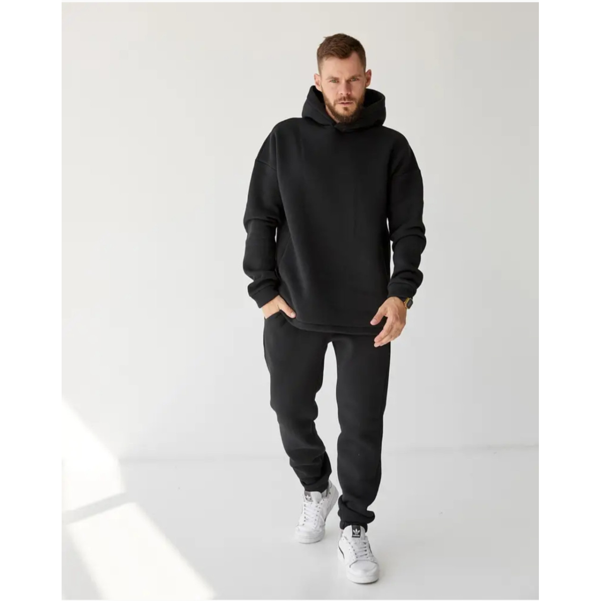 Худі-кенгуру із глибоким капюшоном. Штани джогери на гумці, з двома кишенями та прошитою широкою гумкою на поясі.