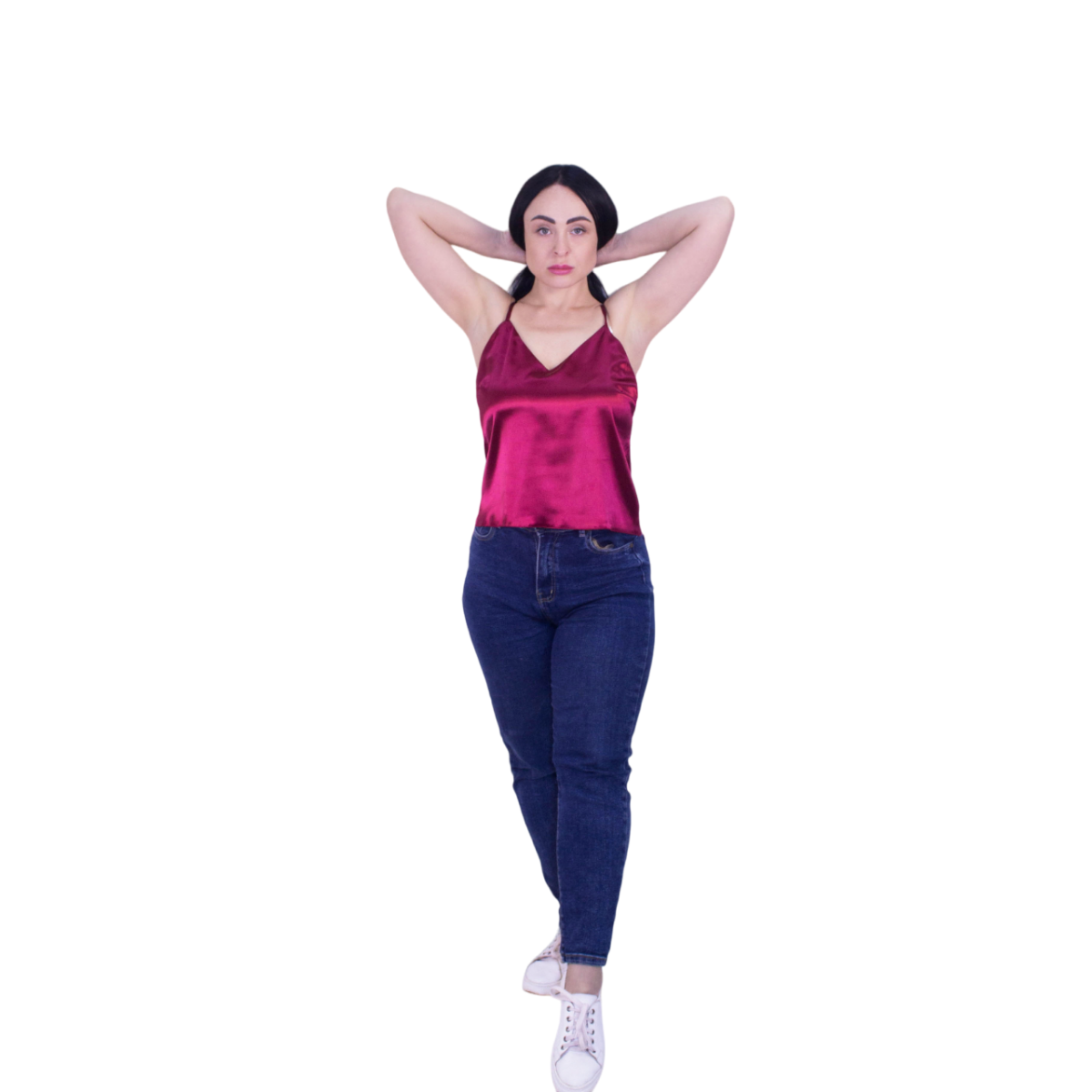 Елегантна жіноча базова майка з атласу — це універсальний елемент гардероба, який легко поєднується з будь-яким стилем. Модель з V-подібним вирізом та тонкими регульованими бретелями підходить як для повсякденних образів, так і для святкових виходів.