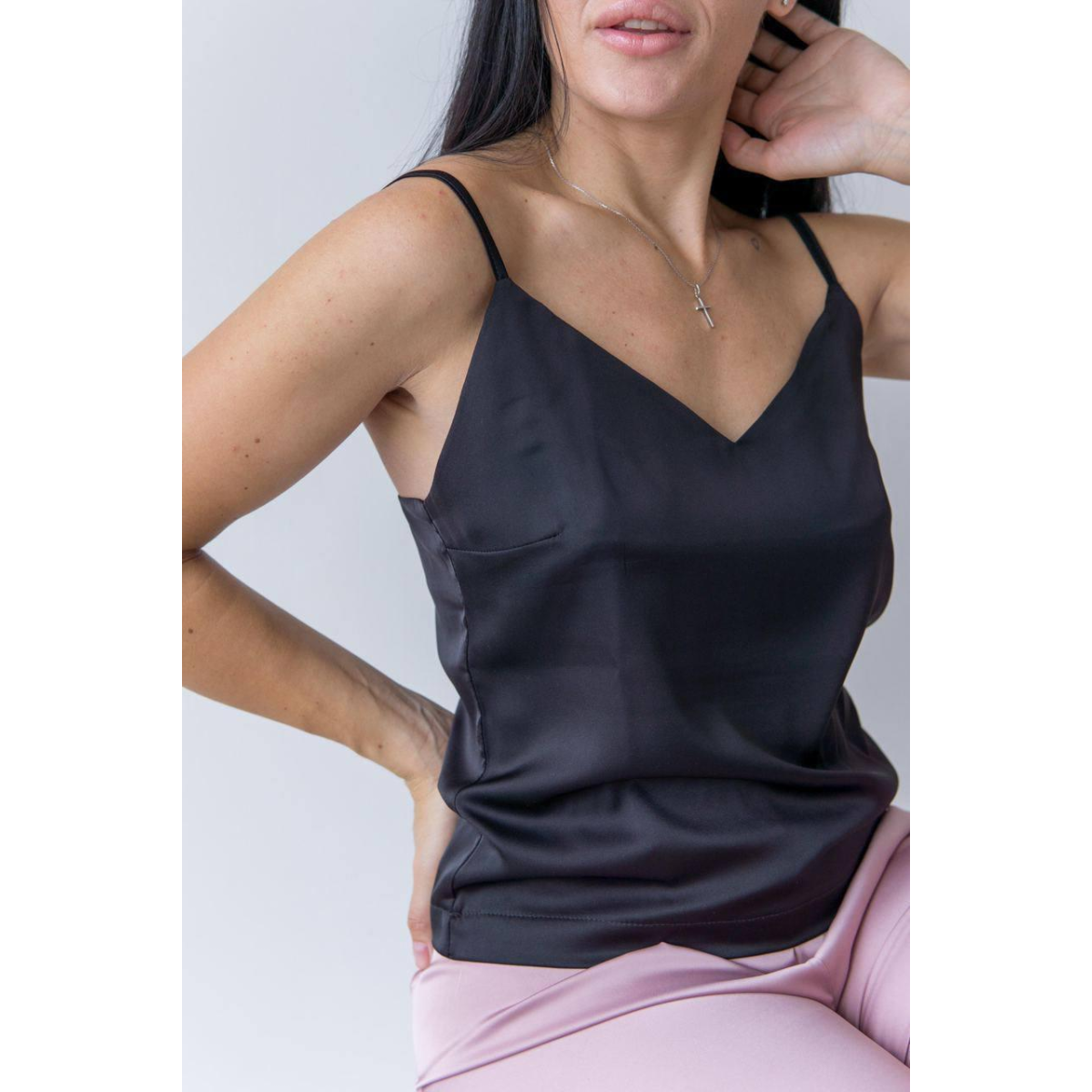 Елегантна жіноча базова майка з атласу — це універсальний елемент гардероба, який легко поєднується з будь-яким стилем. Модель з V-подібним вирізом та тонкими регульованими бретелями підходить як для повсякденних образів, так і для святкових виходів.