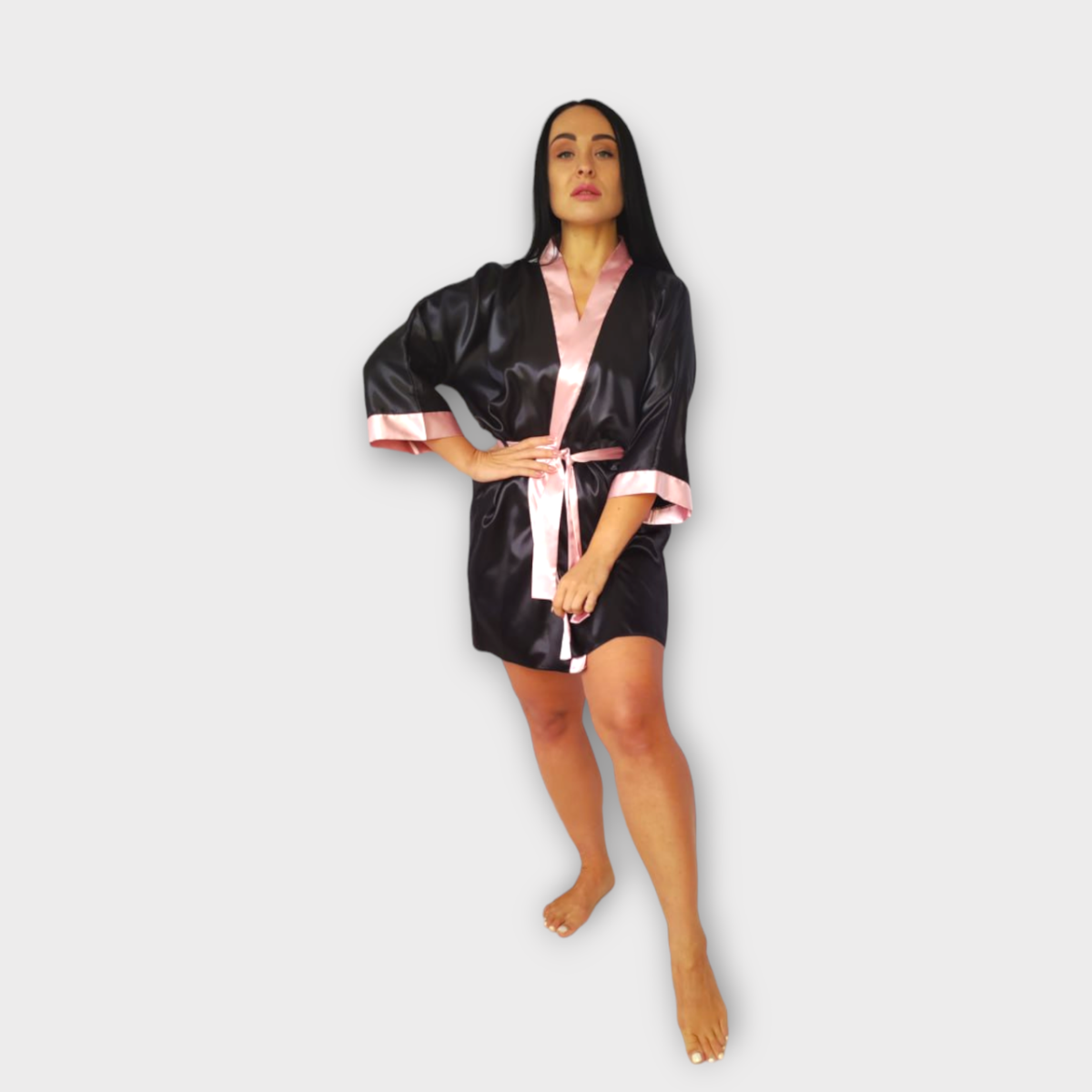 Жіночий атласний халат 90 см чорний із рожевими манжетами XL/2XL