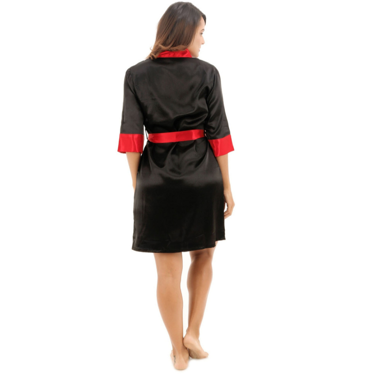 Жіночий атласний халат під пояс довжина 90см чорний із червоними манжетами.M/L
