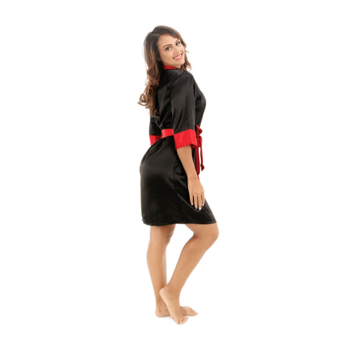 Жіночий атласний халат під пояс довжина 90см чорний із червоними манжетами. XL/2XL