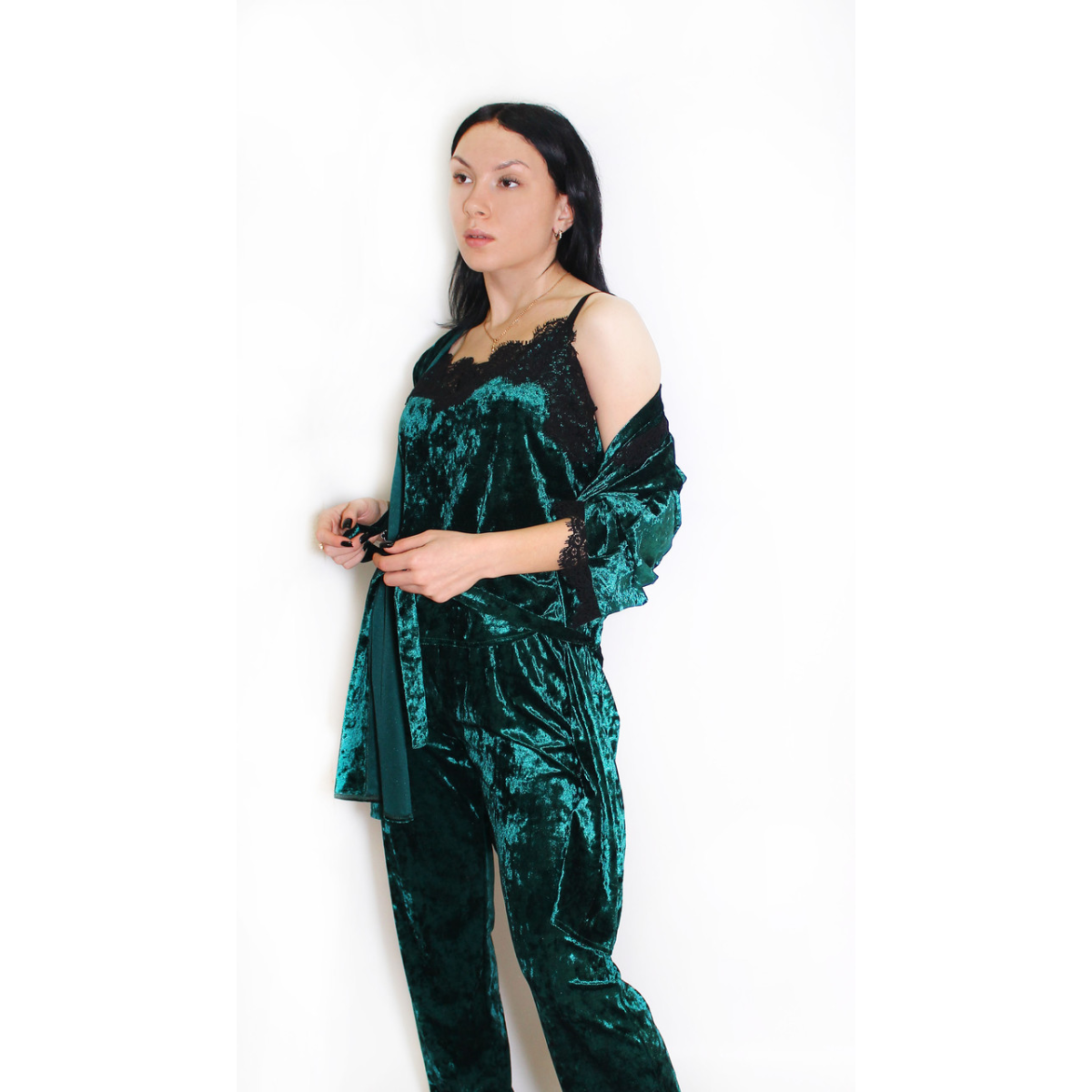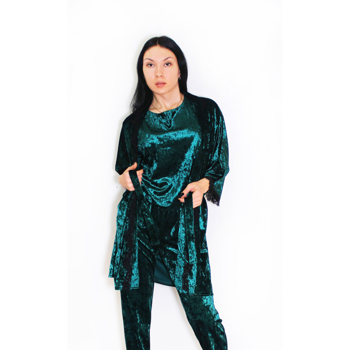 Романтичний жіночий комплект майка з шортами і халатик, виконані з ніжного мармурового велюру.
