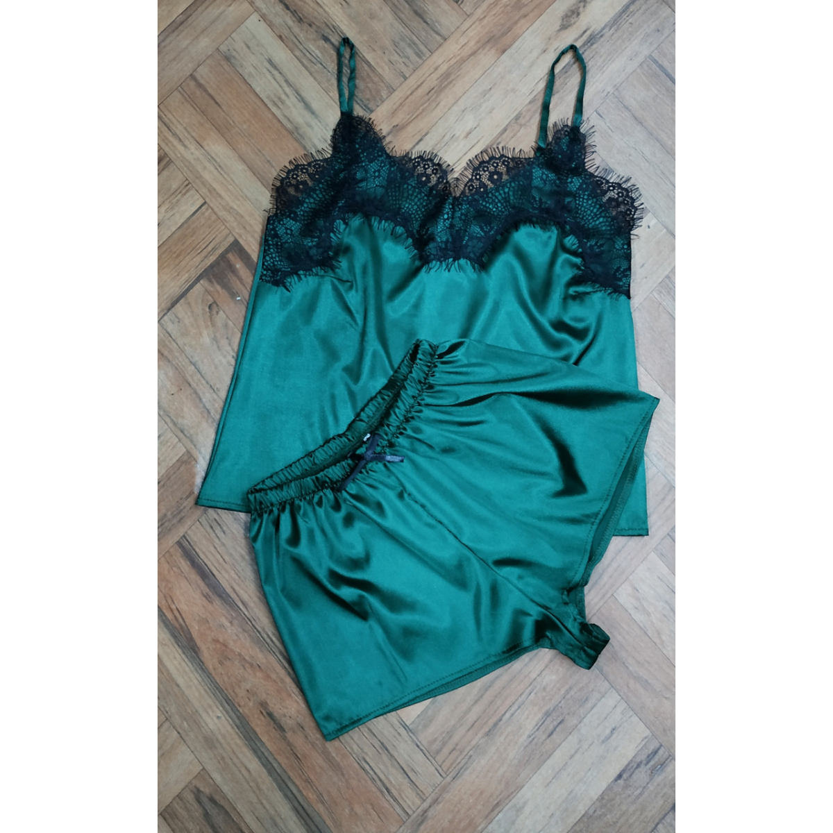Комплект халат і піжама жіночая с мереживом майка+шорти, зелений L