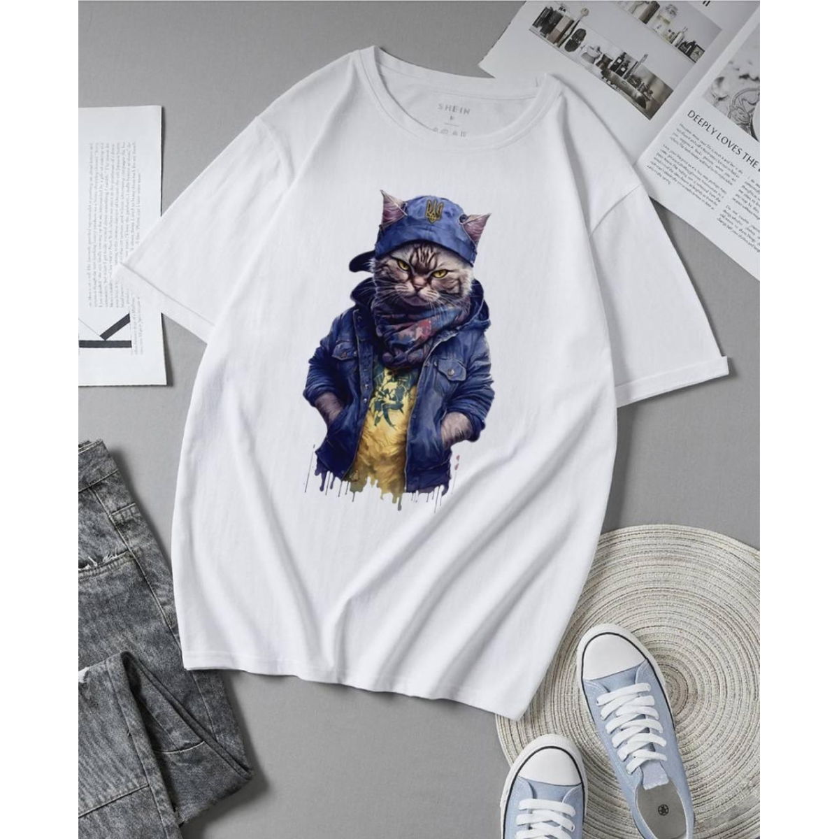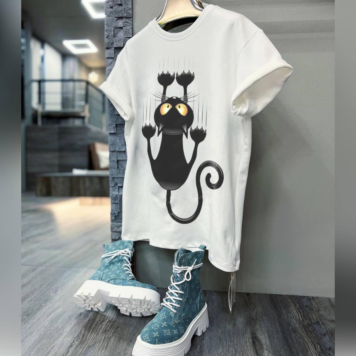 Футболка жіноча турецький трикотаж 3D накат Білий, Чорний кіт