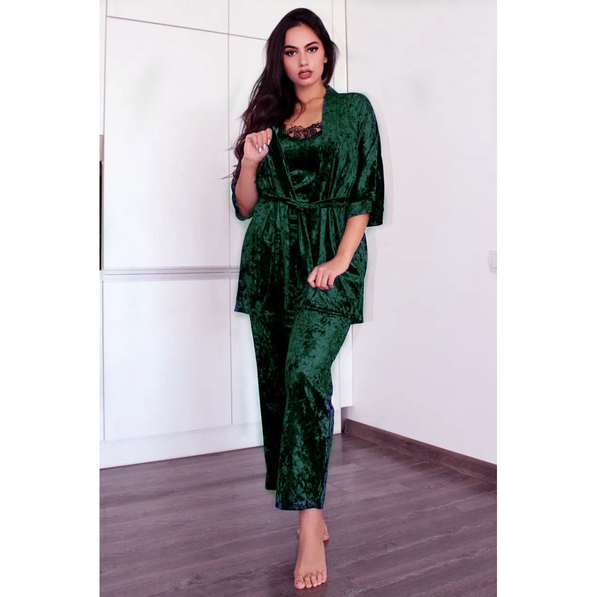 Хочете виглядати розкішно в дома? Тепер це дуже просто з комплектом з мармурового велюру прикрашеного мереживом. У ньому ви відчуєте себе неймовірно чарівною.