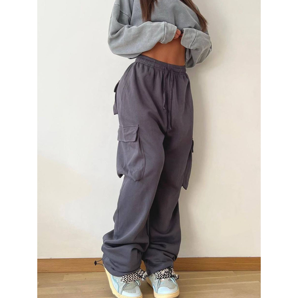 Штани карго на резинці, з накладними кишенями та прошитою широкою резинкою на поясі, мають шнурок. Низ на затяжках.