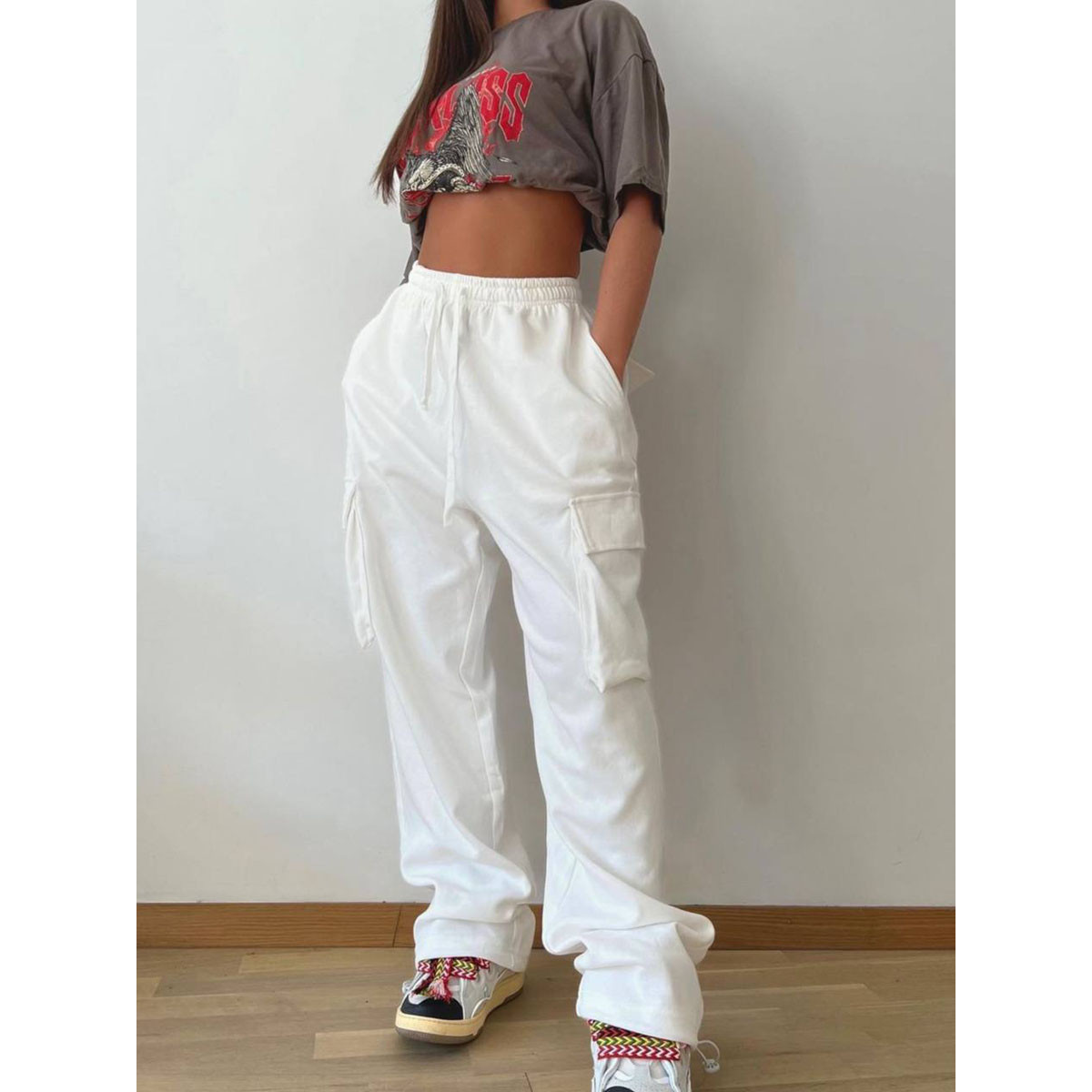 Штани карго на резинці, з накладними кишенями та прошитою широкою резинкою на поясі, мають шнурок. Низ на затяжках.
