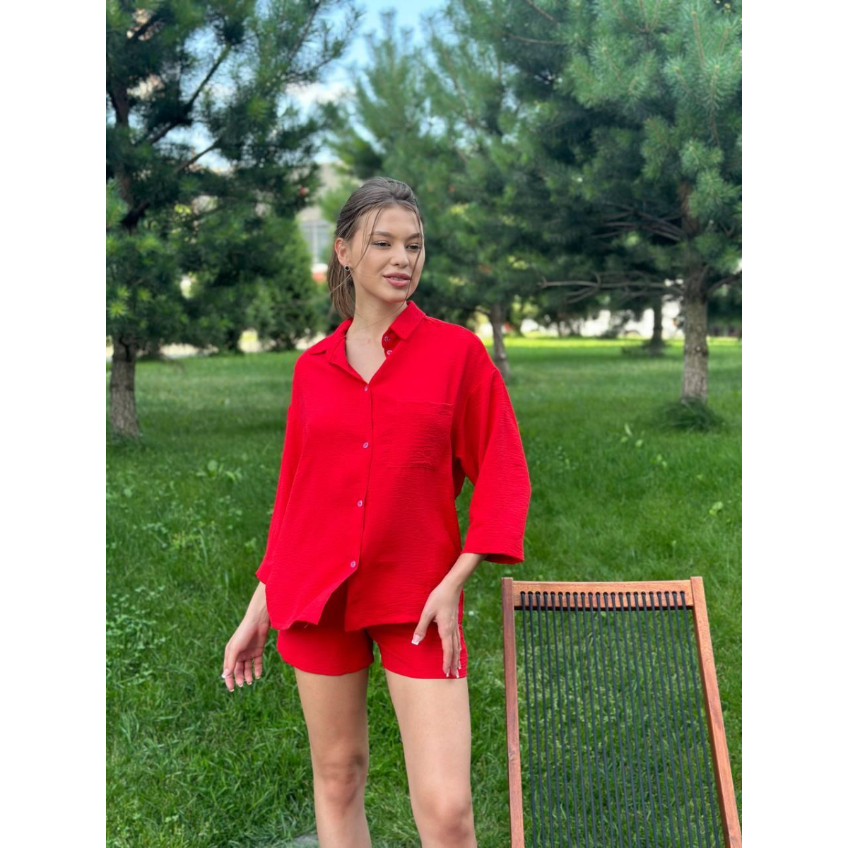 Костюм-двійка жіночий літній, креп-жатка, Червоний, L