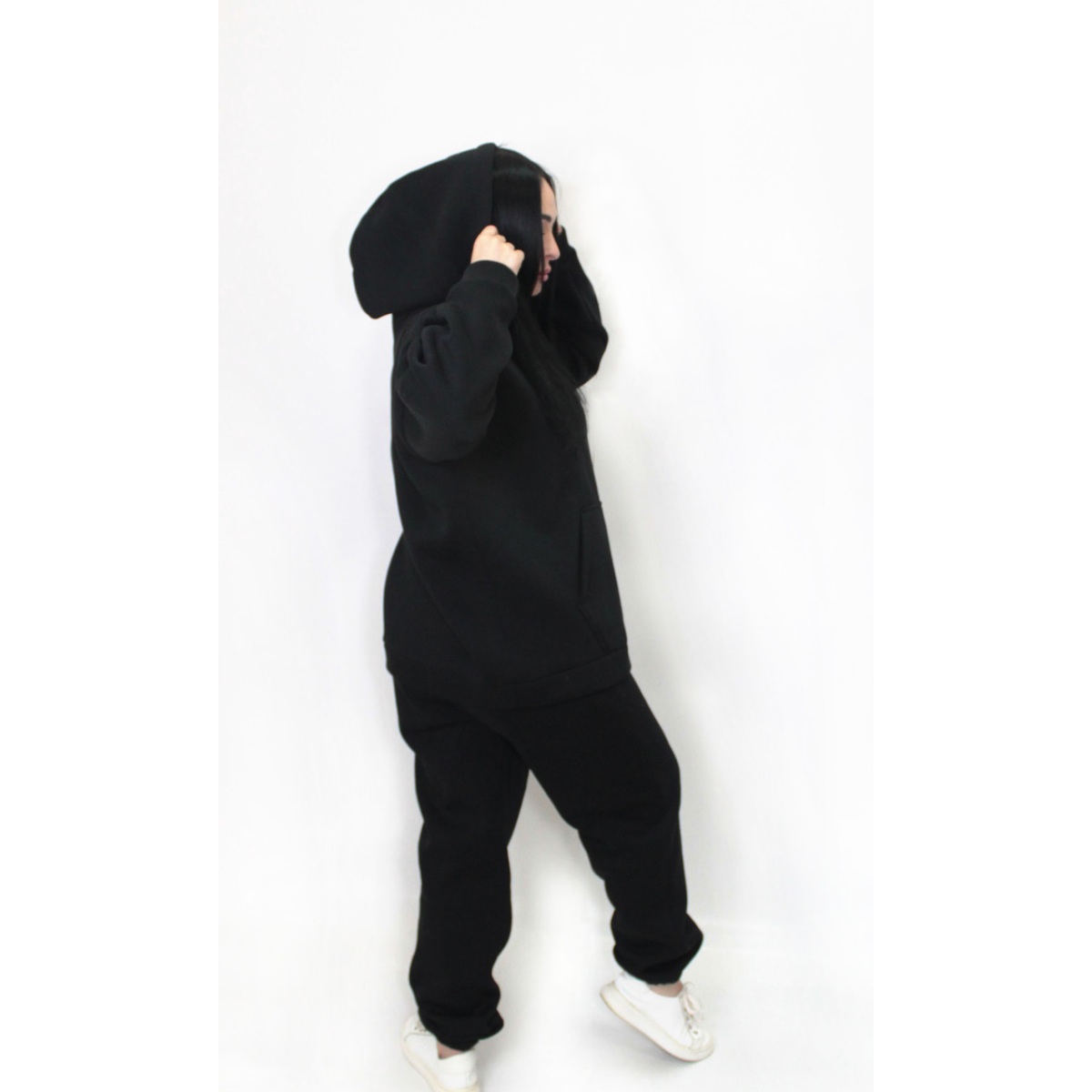 Худі-кенгуру із глибоким капюшоном. Штани джогери на гумці, без кишень та прошитою широкою гумкою на поясі.
