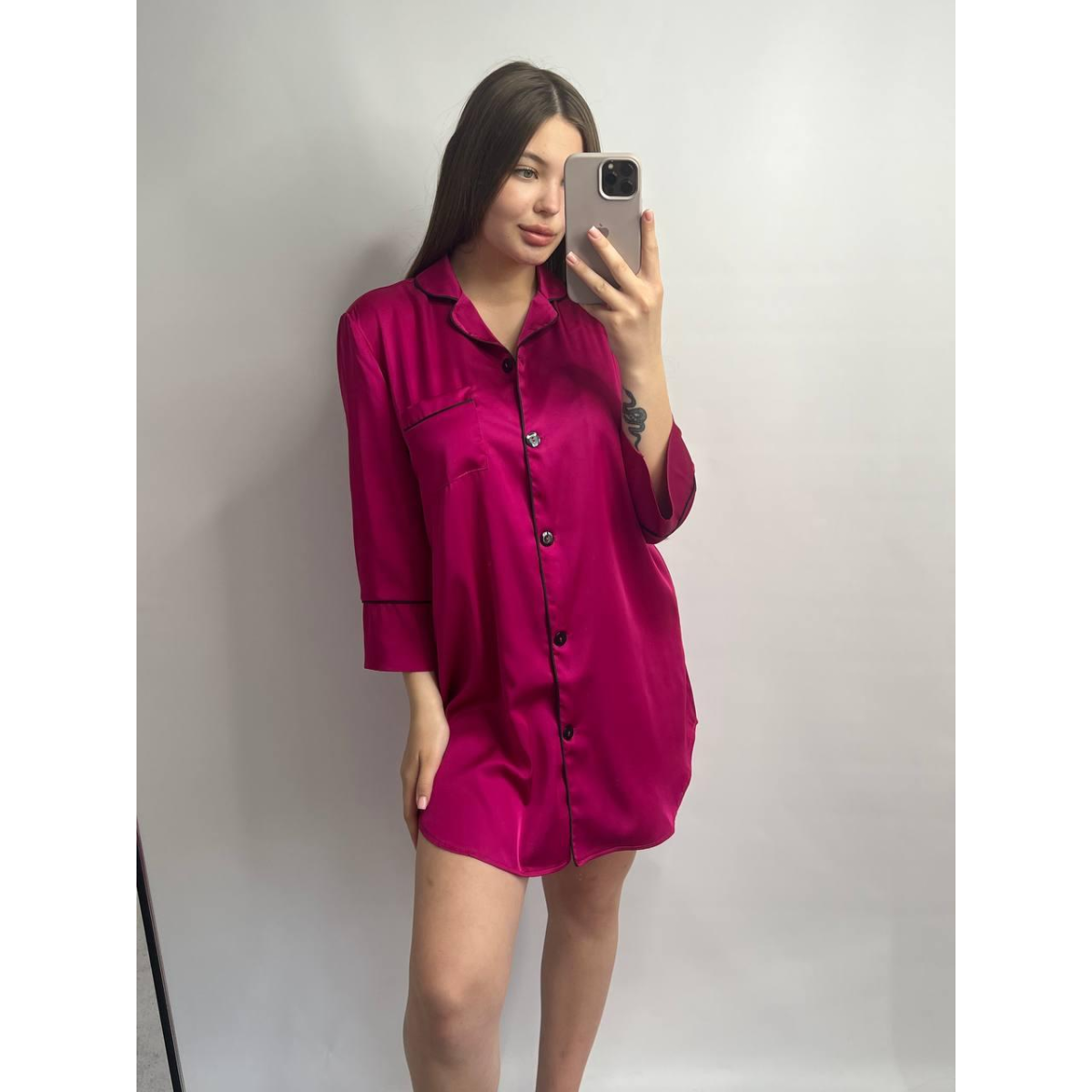 Жіноча нічна сорочка подовжена шовкова. Малиновий, S