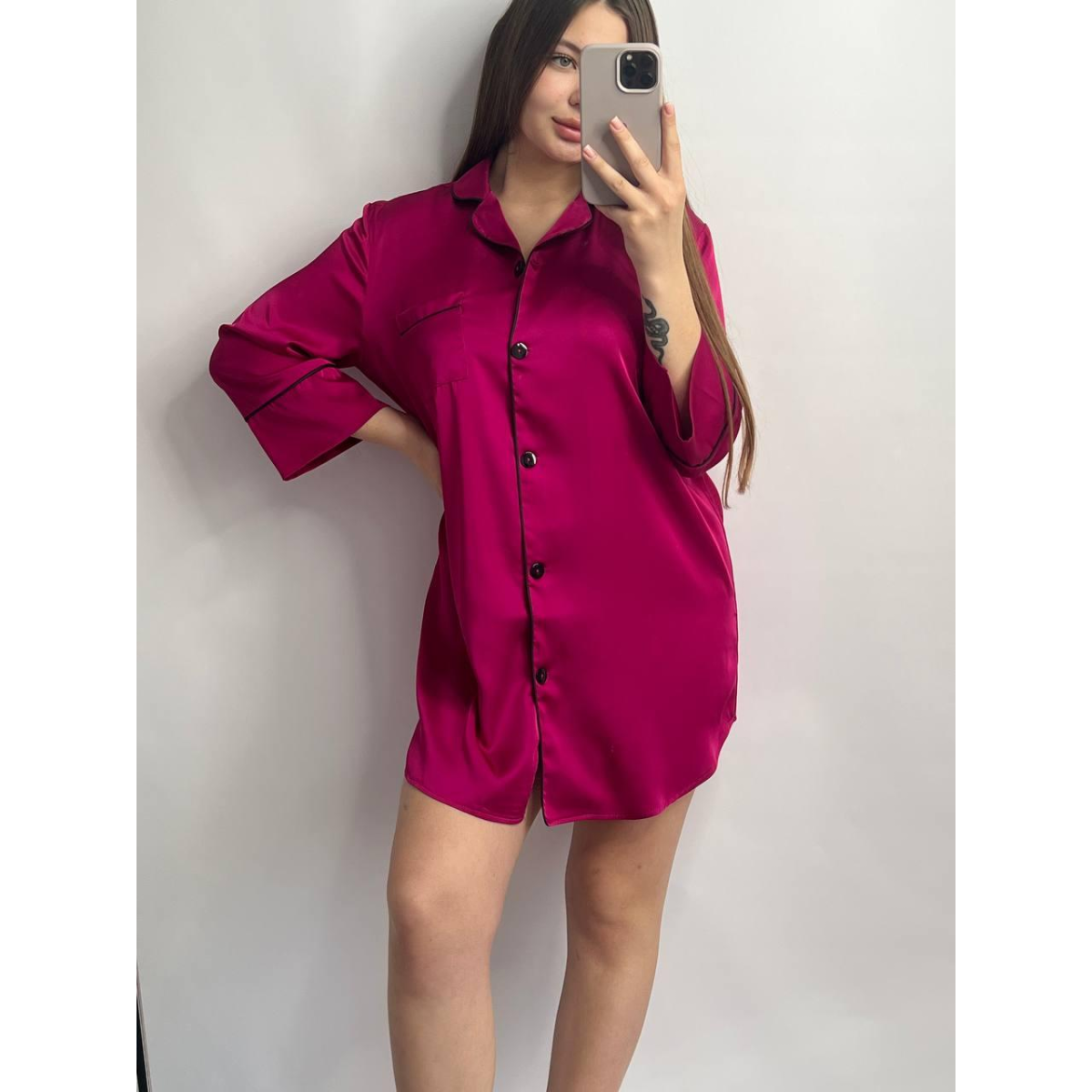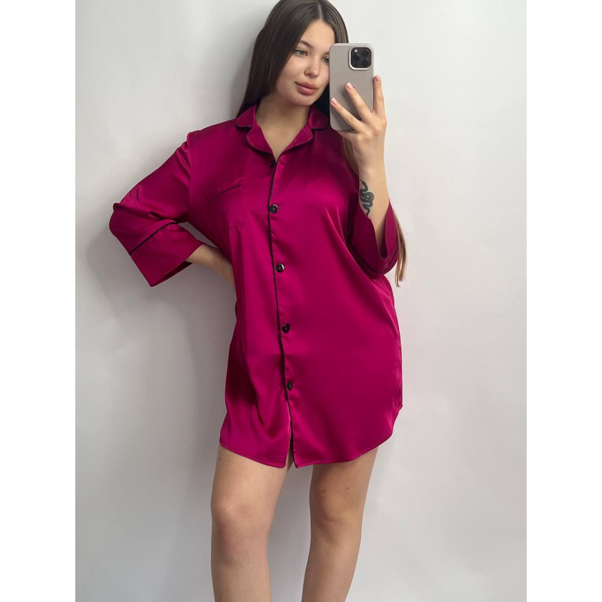 Жіноча нічна сорочка подовжена шовкова. Малиновий, L