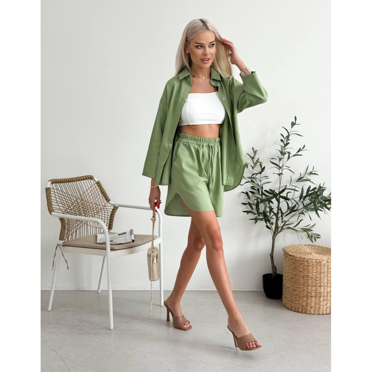 Пориньте в атмосферу легкості та елегантності літнього сезону з нашим жіночим лляним літнім костюмом. Цей комплект складається з сорочки на ґудзиках вільного крою та подовжених шортів на гумці з кишенями, що ідеально підходять для створення стильного та комфортного образу в спекотні дні.