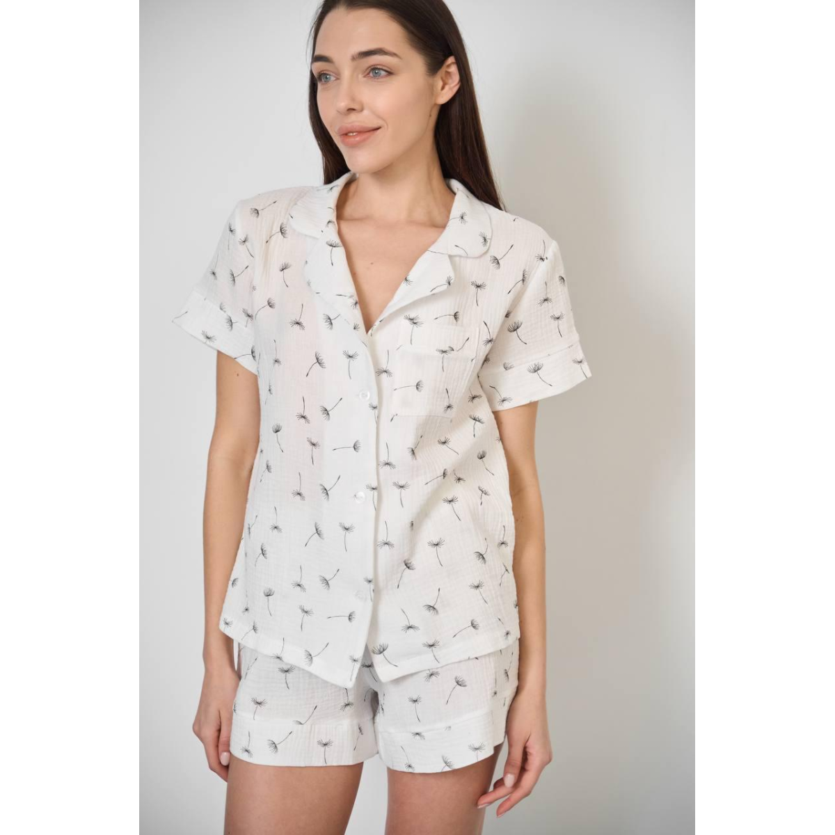 Відпочиньте у затишку та комфорті у нашому домашньому комплекті, створеному спеціально для моментів релаксу та затишку. Представляємо вам набір із сорочки з коротким рукавом на ґудзиках та шорт із натуральної тканини муслін.