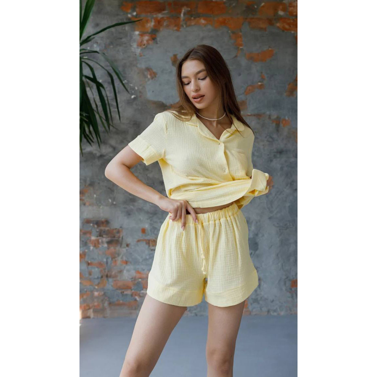 Відпочиньте у затишку та комфорті у нашому домашньому комплекті, створеному спеціально для моментів релаксу та затишку. Представляємо вам набір із сорочки з коротким рукавом на ґудзиках та шорт із натуральної тканини муслін.