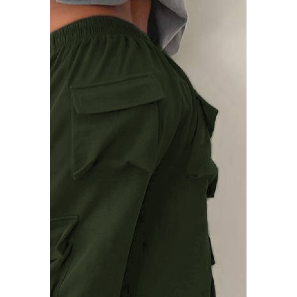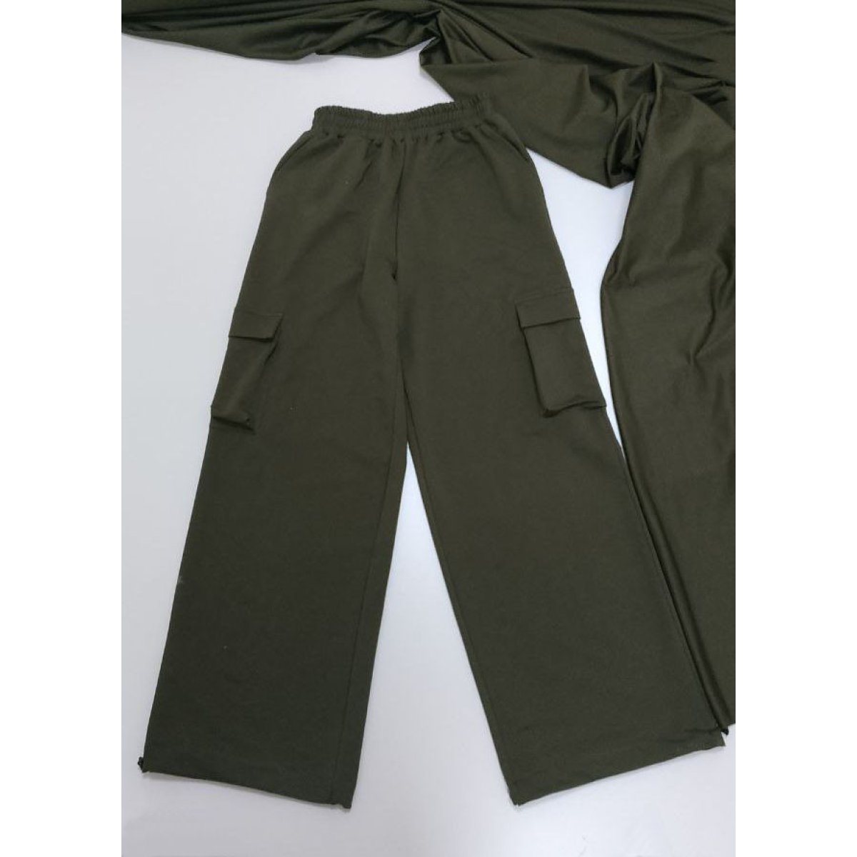 Штани карго на резинці, з накладними кишенями та прошитою широкою резинкою на поясі, мають шнурок. Низ на затяжках.