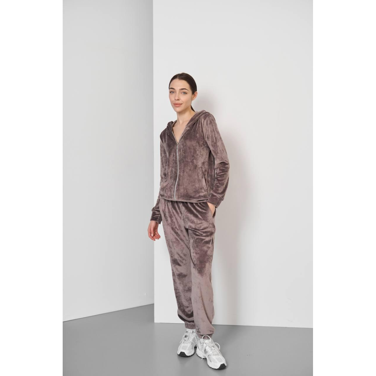 Жіночий велюровий костюм на змійці з капюшоном Шоколадний, M