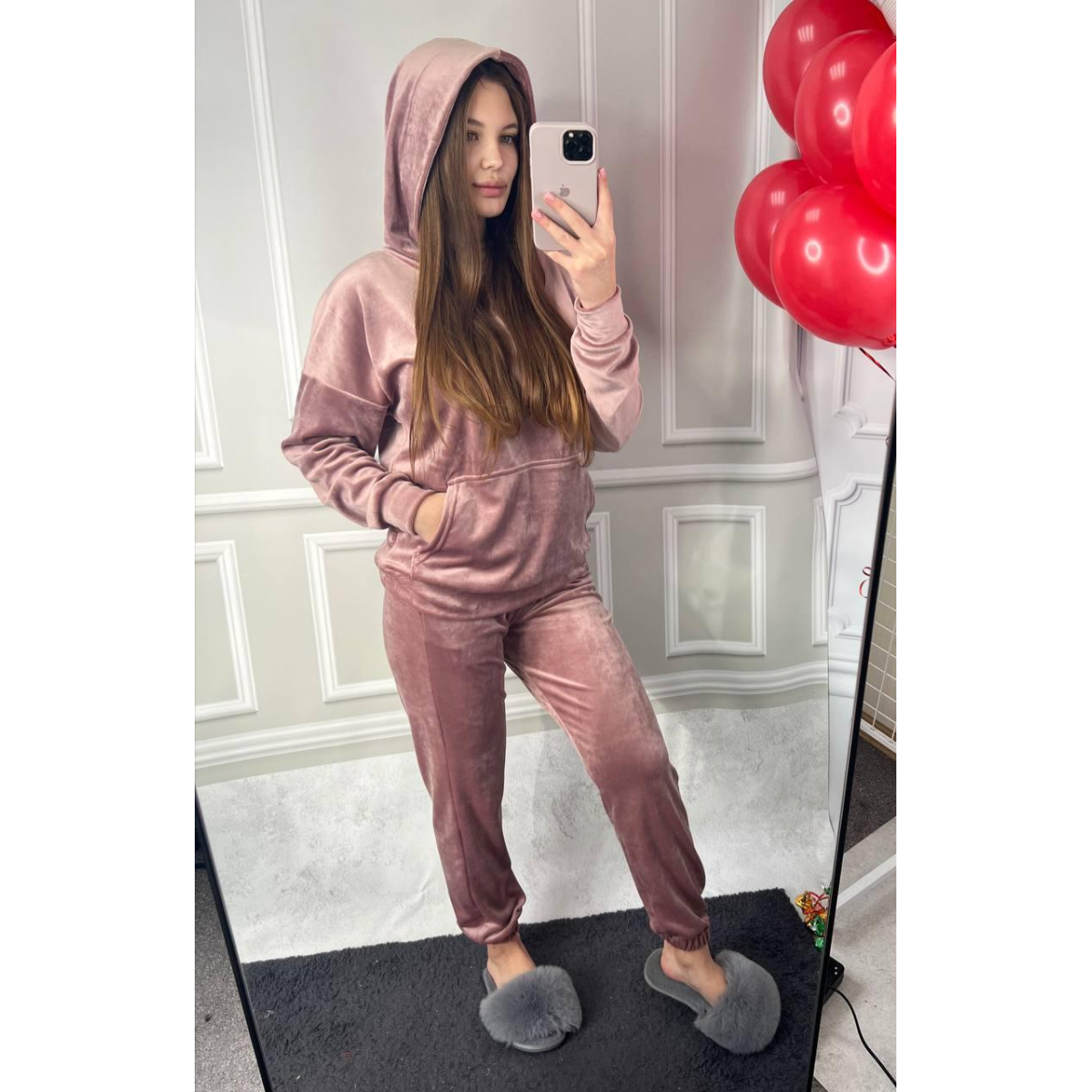 Жіночий велюровий костюм із капюшоном Рожева пудра, S
