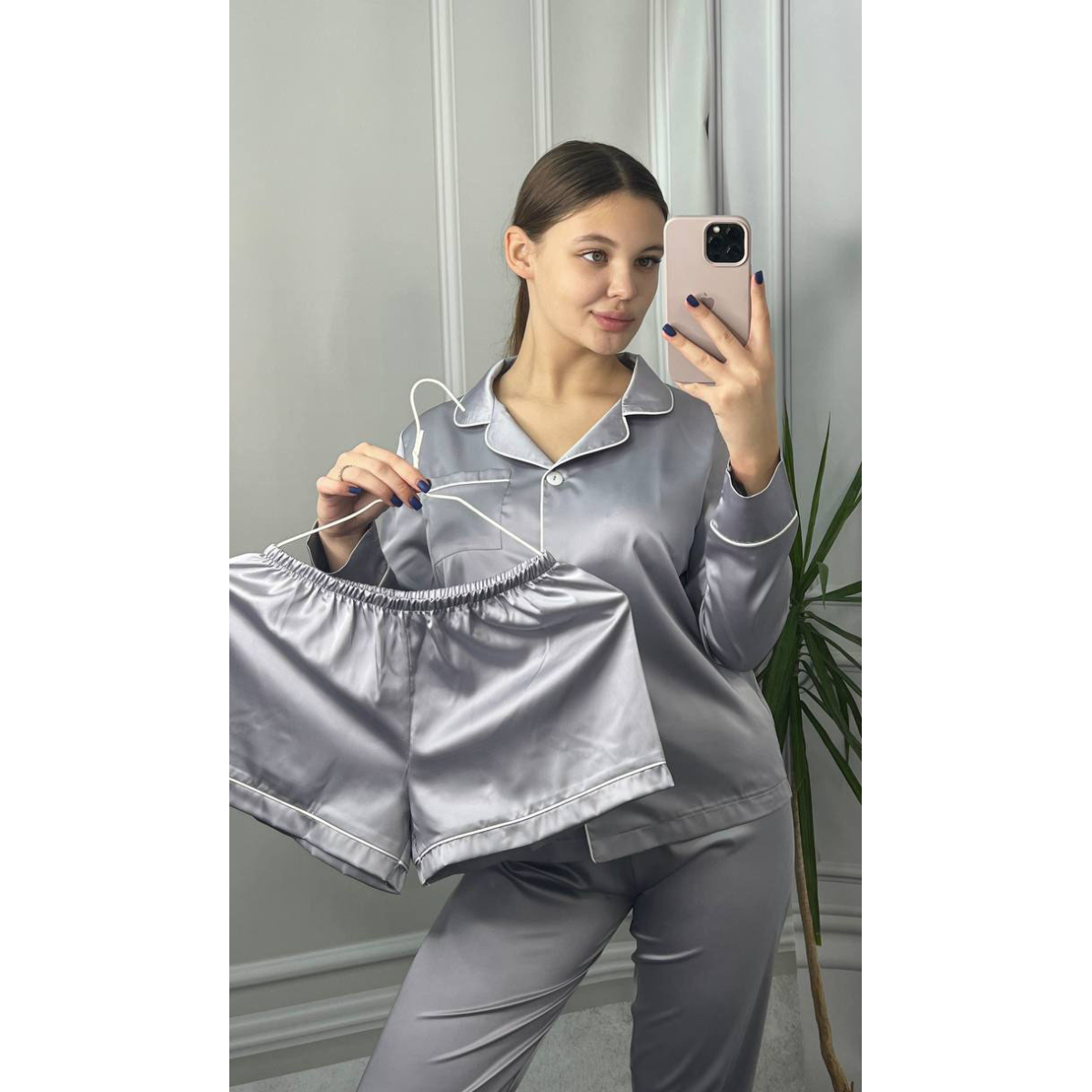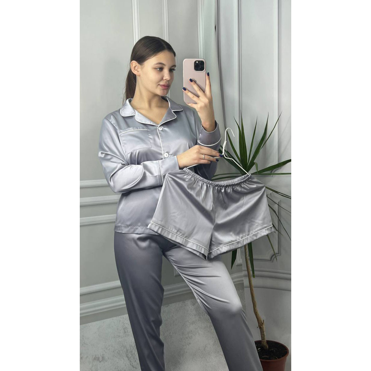 Комплект шовковий трійка сорочка з шортами та штанами Срібло, M