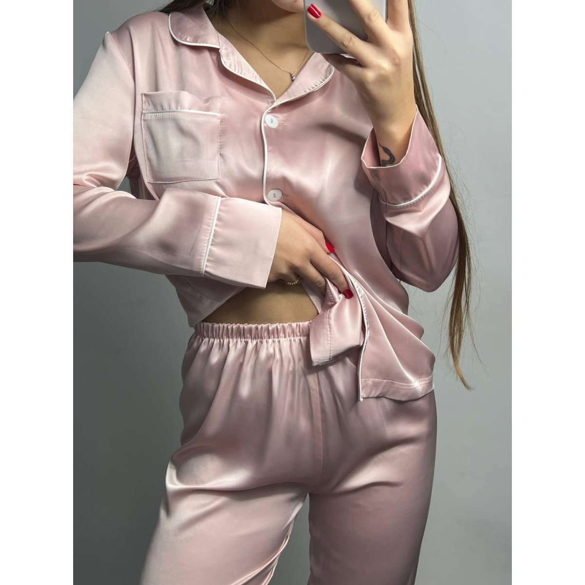 Комплект шовковий трійка сорочка з шортами та штанами Пудра, S