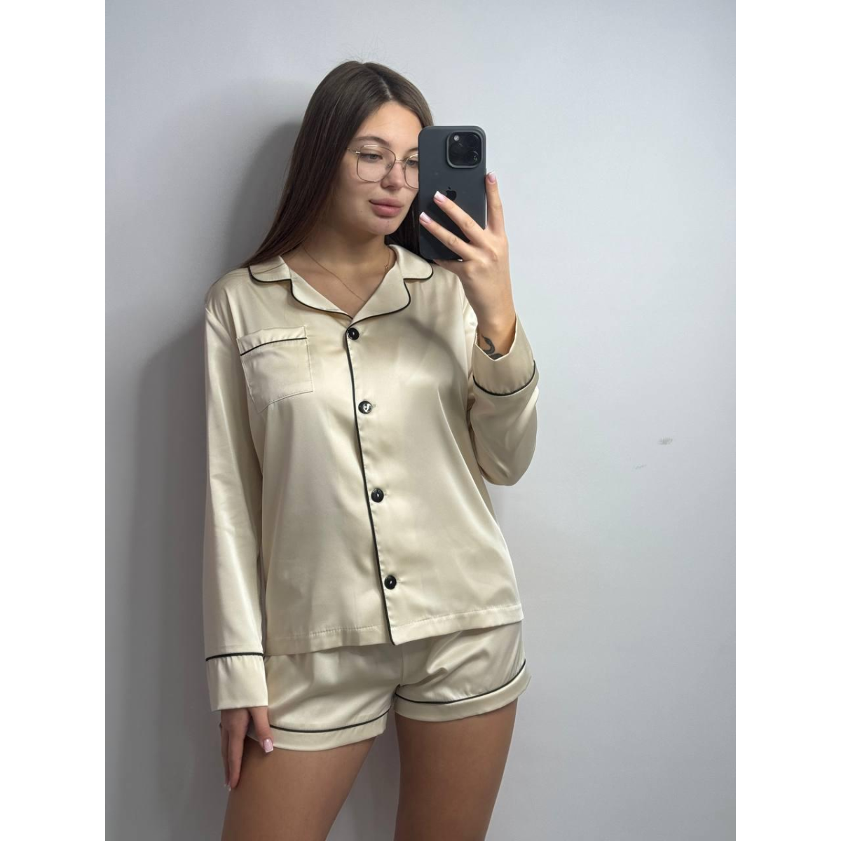 Комплект шовковий трійка сорочка з шортами та штанами Молочний, XL
