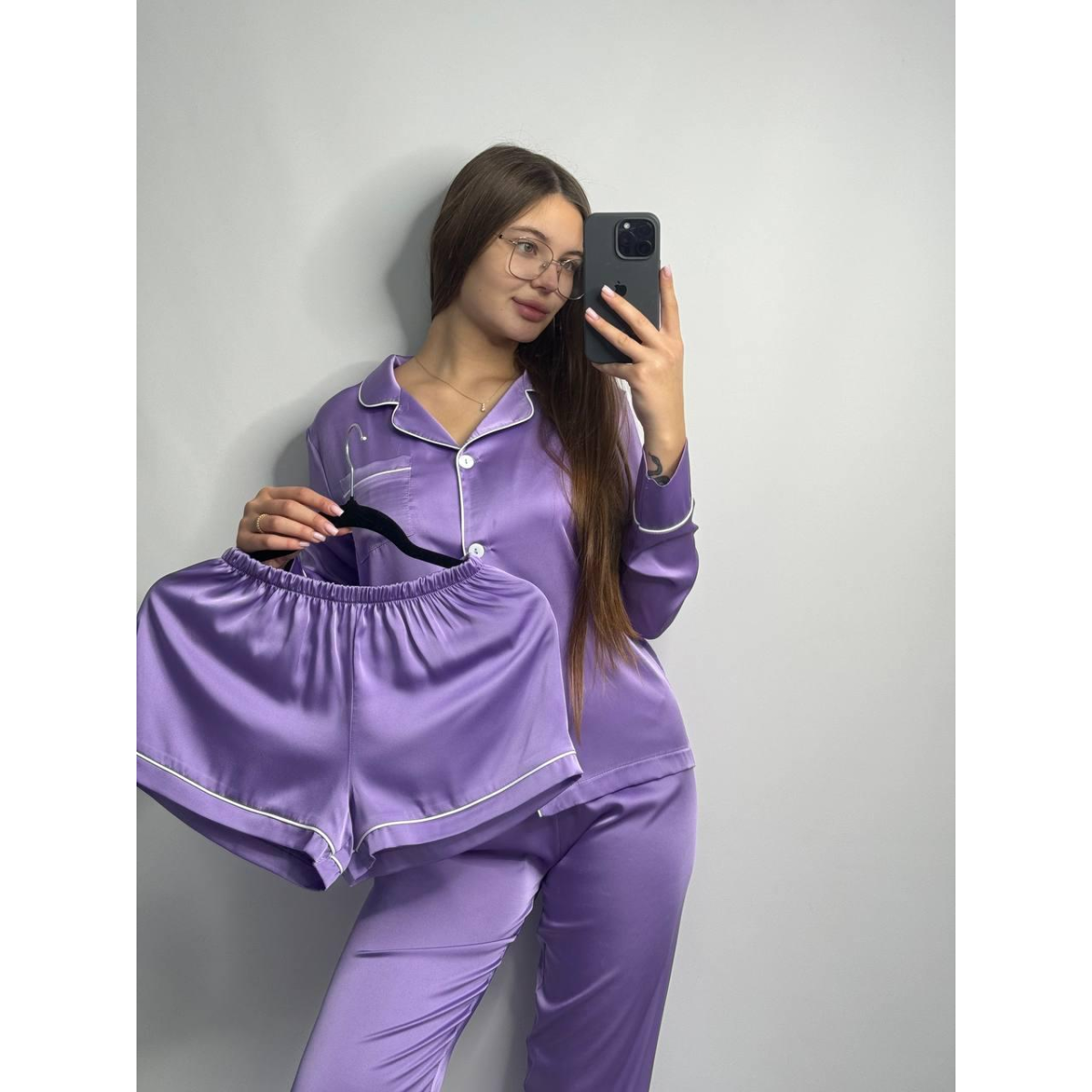 Комплект шовковий трійка сорочка з шортами та штанами Лаванда, L