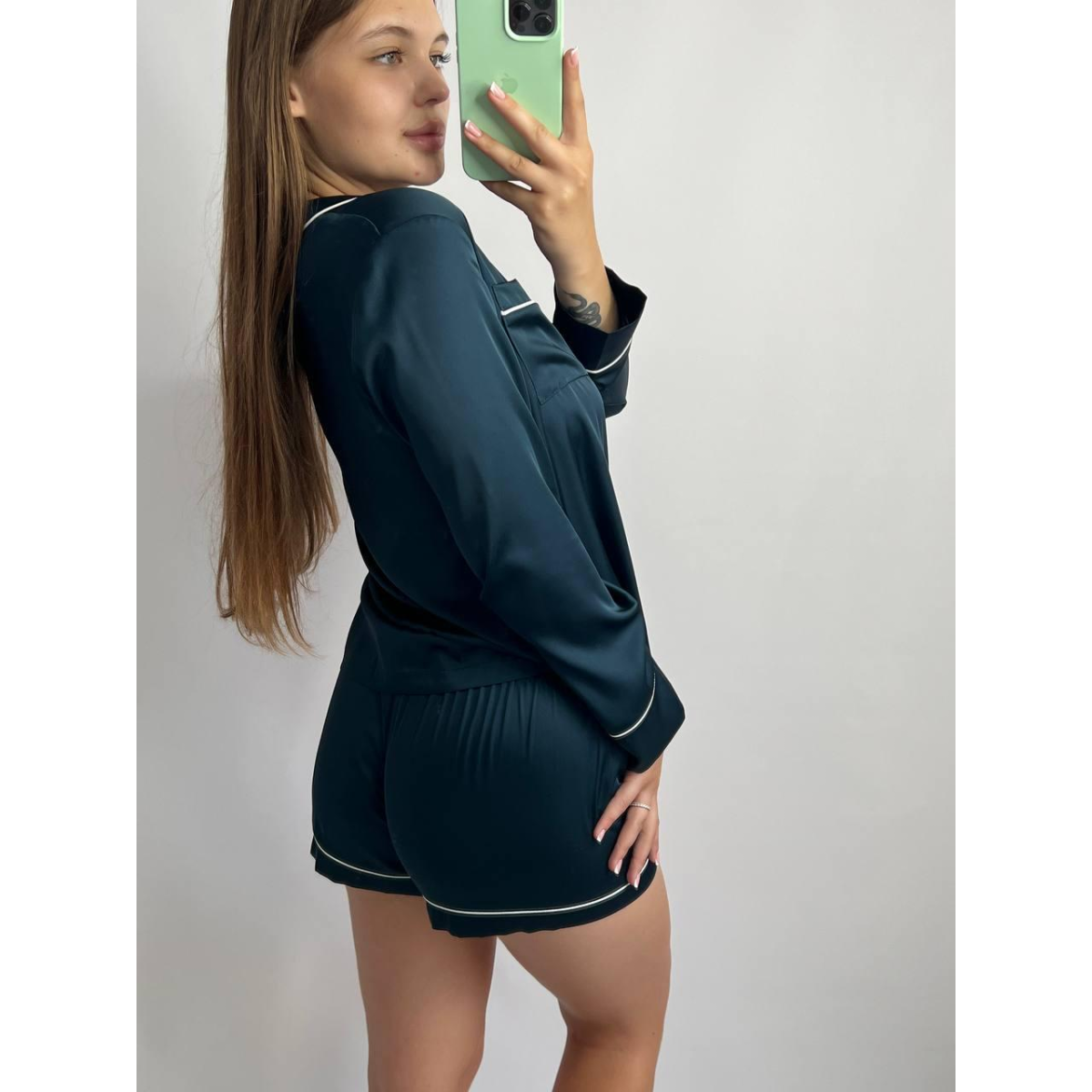 Комплект шовковий трійка сорочка з шортами та штанами Темно-смарагдовий, S